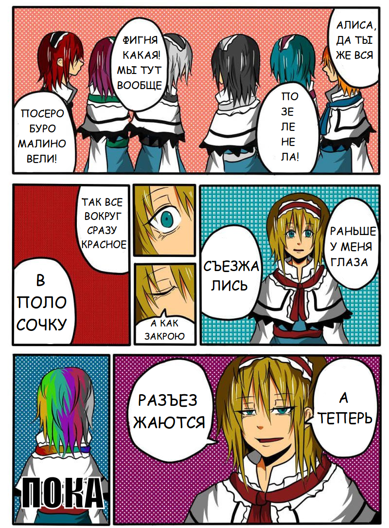 Классный автор: симпатичный стиль и эпичные сюжеты (иногда достаточно сибанутые). Также хороший пример того, как можно творить мангу, экономя на рисуночном материале. Истории есть например про то как Коакума жестко троллила Пачульку и как ничем хорошим это не кончилось. Или про то, как Юка миловалась с подсолнухом. Или как Эйрин поехала на почве салфеток. Ну и прочие.