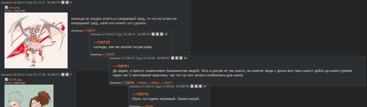 Он сделал свой перекат с теми рисунками с пиксива, что в итоге привело к бомбежки значительной части треда и появлению ЧЕТЫРЕХ параллельных перекатов. Один из тредов был стандартным с коллажиком, поэтому осталось лишь подождать, пока Абу десантирует нам дежурного мода для экстерминатуса всех лишних. И тут мод нанёс нам удар в псину.