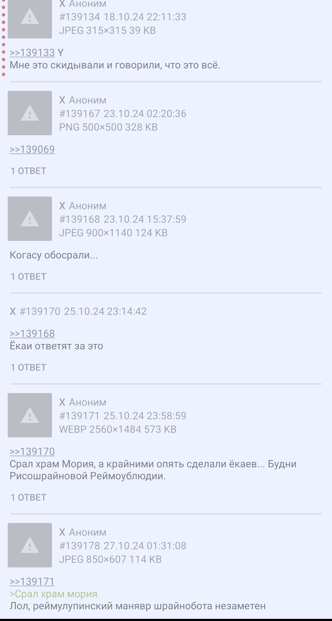 >>140789 >>140796 >>140799 >>140797 ВЫХОДЦЫ С ГОРЫ ЁКАЕВ ИЗИВИВАЮТ, ПОХИЩАЮТ И УБИВАЮТ ЖИТЕЛЕЙ ДЕРЕВНИ, НЕ НЕСЯ ЗА ЭТО НИКАКОГО НАКАЗАНИЯ @ ГРУППА ЁКАЕВ ДОМОГАЛАСЬ ДО МЕСТНОЙ ЖИТЕЛЬНИЦЫ, НО ПО ИТОГУ ЗАПЕЧАТАЛИ ПАРНЯ, КОТОРЫЙ ПЫТАЛСЯ ЕЁ ЗАЩИТИТЬ @ ВЫХОДЦЫ ИЗ ГОРЫ ЁКАЕВ СВОБОДНО ДЕМОНСТРИРУЮТ САМЫЕ СМЕРТЕЛЬНЫЕ ДАНМАКУ, В ТО ВРЕМЯ КАК ПО ЗАКОНАМ ГЕНСОКЁ МОЖНО ТОЛЬКО НЕЛЕТАЛЬНЫЕ КОПИИ @ ЮКАРИ ТЕЛЕПОРИТРУЕТСЯ В САМЫЙ ЦЕНТР ГОРЫ ЁКАЕВ ЧТО-БЫ ПОЦЕЛОВАТЬ ГАЗЕТУ АЙИ. @ ОФИЦАЛЬНЫЙ ЛОЗУНГ ГОРЫ ЁКАЕВ - "АХУМАТА-САН - СИЛА!" (ВСЕ СТАРАТЕЛЬНО ИГНОРИРУЮТ ТОТ ФАКТ, ЧТО АХУМАТА-САН УБИВАЛА ЛЮДЕЙ) @ СТАРЕЙШИНА ДЕРЕВНИ ВЫДЕЛИЛ 2.5 ВАДО КАЙЧИН НА СТРОИТЕЛЬСТВО ВЫСОЧЕННОЙ ПАГОДЫ В ГОРЕ ЁКАЕВ Можете продолжить бугурт, если хотите.