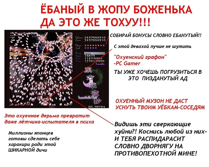 Хотя нахуя я пытаюсь в аргументацию с неосилятором ебаным, лол. Лучше бы задрочил шестерку на лунатике без бомб в тхпраке, да под пиво, да под свою музыку, аутентичный тохо опыт, была бы тебе честь и хвала, думаю в пахомии таких супер игроков на пальцах одной руки можно посчитать. А коупить на тохаче любой может.
