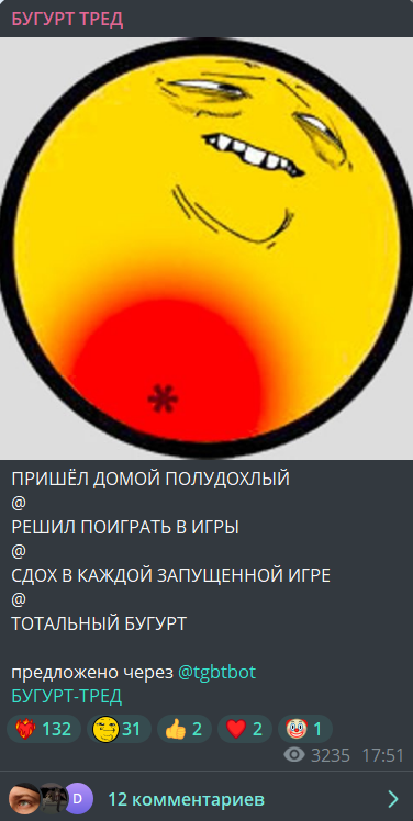 >>134126 постом ошибиться - ладно похуй, бывает тредом ошибиться - сомнительно, но окэй. ошибиться тредом, выделяя пост - это уже какой то сверх уровень ебанутости, такого не видел.