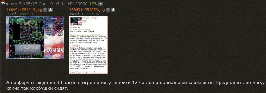 >>133848 >Забыл учесть еще прямоту рук. Обычные руки у меня, не хардкорщик. Я так и прошел. >Да и к тому же, мне некуда второй монитор ставить. Ну что уж тут поделать. Да и на альтабе можно или с телефона. >>133849 >Что ты прошëл? Touhou 11 - Subterranean Animism на нормале, но с контами (меня пока устраивает, так как опыта немного в подобных играх). >>133850 >Если получаешь удовольствие и всерьёз распробовал попытки пройти игру без пауз Все верно. Без каких либо гайдов у меня бы ушло еще часов 70, а так где-то часов 5 примерно. Это к слову о том, что тут смеялись над теми, что некоторые челиксы очень долго проходят.