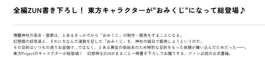 На 1 апреля 2025 года назначен релиз(возможный) новой официальной печатной работы от Зуна. Если судить по второму скрину, то описывается как Рейму начинает изготавливать и продавать Омикудзи(3 пик) с изображениями и судьбой ёкаев, чтобы решить последствия инцидента. Так же должны будут появиться все персонажи тохо. Написано, что рекомендуется к прочтению фанатам.