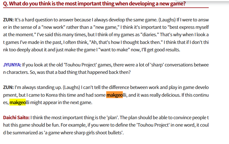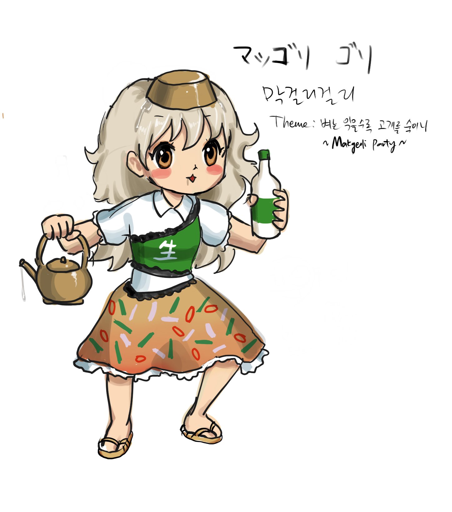 Немного о мероприятии в Корее 8 февраля. https://houraisai.kr/ Сам фестиваль прошёл хорошо, однако интересно о новом выдуманном персонаже, который корейцы уже успели обрисовать лишь на одном предложении из интервью, в котором Зун сказал, что ему понравился напиток, который он употреблял на фестивале "Хорай-Сай". Персонаж по имени Макгеоли по сути берущий название корейского алкогольного напитка.