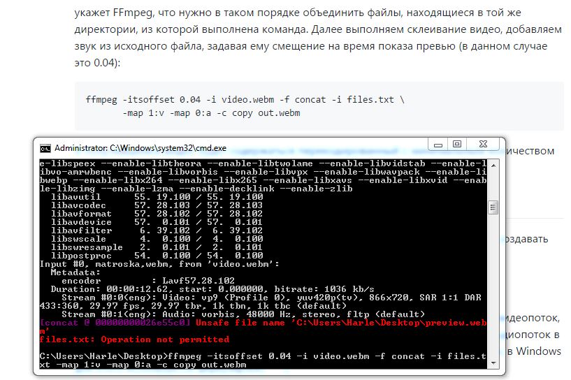 >>46521 Что-то не понятно нихуя с этой командой ffmpeg -itsoffset 0.04 -i video.webm -f concat -i files.txt \ -map 1:v -map 0:a -c copy out.webm Как она вводиться должна? Сначала первая строка - enter - вторая строка? Или всё одной строкой без энтеров? Как должно выглядеть содержимое txt файла? Путь к файлу надо заключать в кавычки или нет?