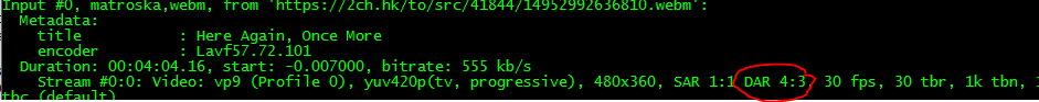 >>55510 А что тебе не нравится с изображением? Полосы? У тебя DAR 16:9 стоит. Пик 1. Например в этой >>55503 вебм DAR 4:3, как и должен быть. Пик 2. Твоё спасение - добавлять в -vf параметр setdar=x:y. Пример: ffmpeg -i webm.webm -vf scale 640:480 -vf setdar=4:3 out.webm