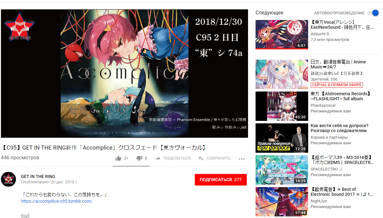 Че, пацаны, Комикет? Turn it up! https://www.youtube.com/watch?v=9lbMudDWh3Q Старый хрустик 黒鳥 как всегда хорош, не говоря уж об Анечке Ханасаки. До чего же топовая тяночка! И поёт хорошо, и сама по себе красавица, ещё и на арфе лабает, аки диавол. Забрал бы её домой и заставил бы косплеить Рейму.