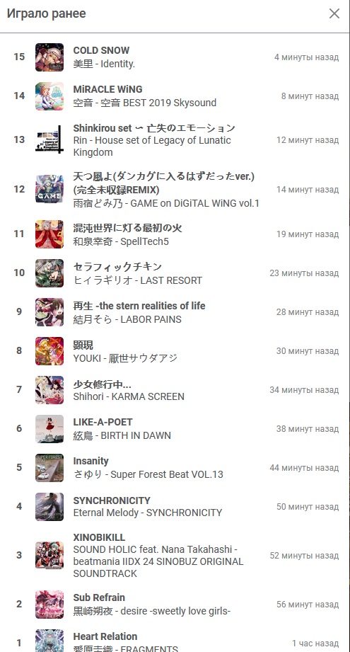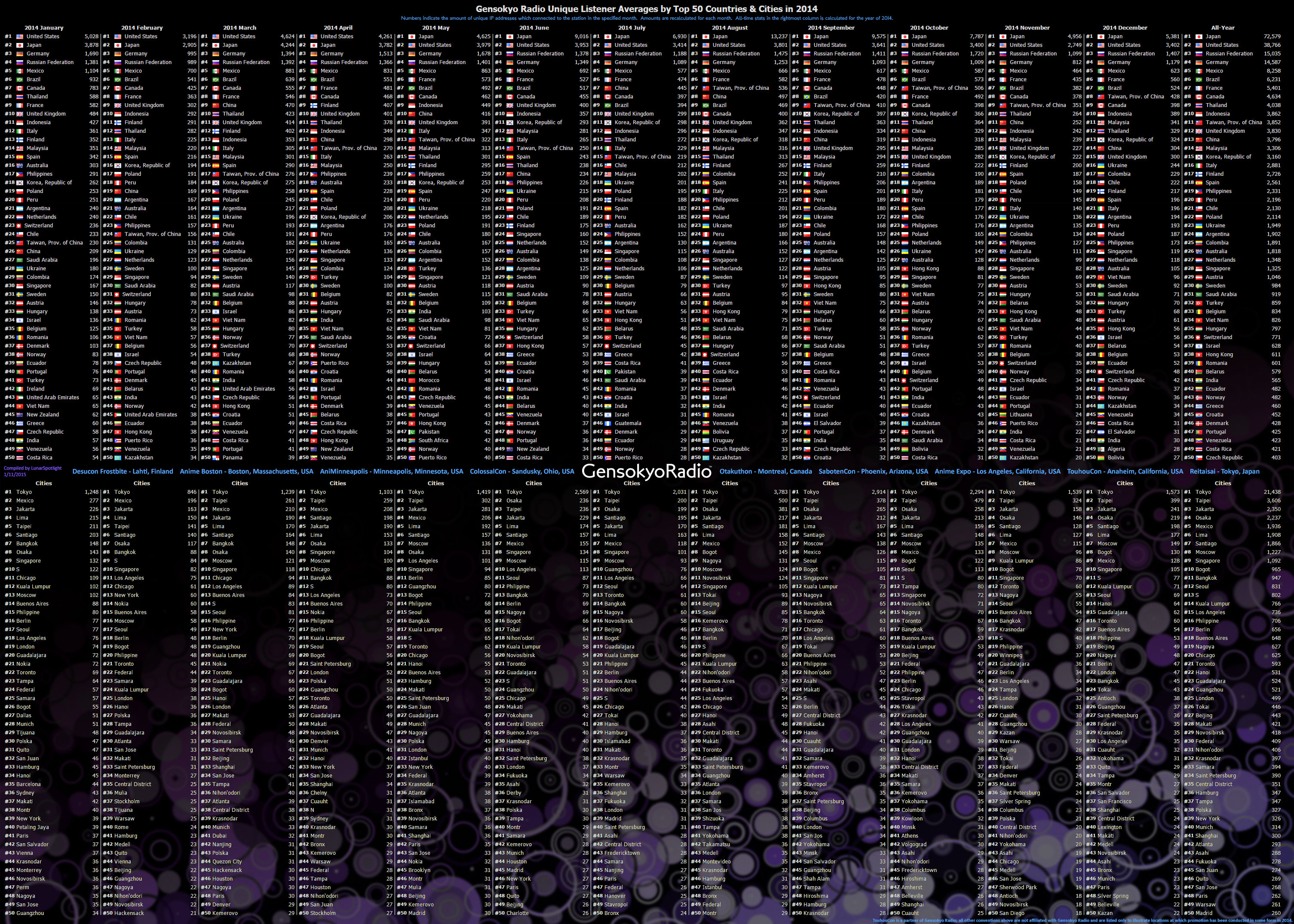 Зацените, какая интересная статистика у Gensokyo Radio за 2014 год. Правда сайт у них до сих пор в каком-то макетном состоянии. А ещё >With more than 1,634 songs from 370 different artists, and 337 albums from 40 >different circles, there's a lot to listen to... >and that's only the current playlist! Это же очень мало! Хотя они могут эту надпись не обновлять годами...