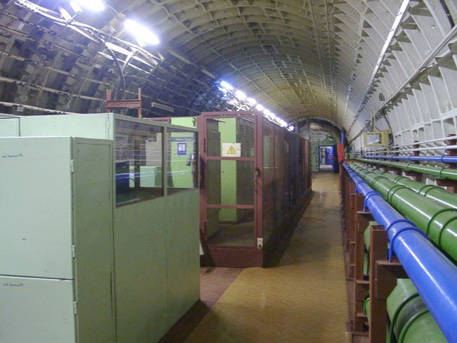 ... Сперва, как культурные - вытерли ноги. Затем осмотрелись. Ярко освещенные коридоры тянулись влево и вправо, прямо за железным трапом-переходом виднелся отрезок неотделанного тоннеля с провешенными кабелями (это переход). Решили обходить сооружение по левой руке (т.е. везде сворачивая только налево). Пол здесь выложен черной рифленой кафельной плиткой, освещение - люминесцентное. Коридор довольно узкий и спрятаться абсолютно некуда ! Справа у земли тянется серебристая труба около полутора метров в диаметре с гофрированными участками. Параллельно ей идут другие трубы и коммуникации на мощных закладных. Над ними располагается бесконечное количество запертых ящиков-секций с надписью "НЗ", но похоже пустующих. И чистота поразительная, ни пылинки, всё окрашено и блестит ! Слева в стене замечаем небольшую гермодверь, а в потолке - квадратные задраенные люки небольшого размера (кабельные «лючки»). Далее справа исчезают трубы и начинаются двери в стене, не доходящей до потолка. Одна из дверей обозначена как "Буфет". В направлении движения висят указатели "К выходам NNAB". По потолку развешена пожарная сигнализация. Коридор поделен на отрезки противопожарными гермодверями (все они открыты).