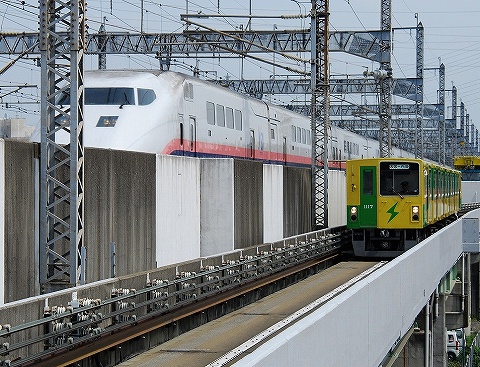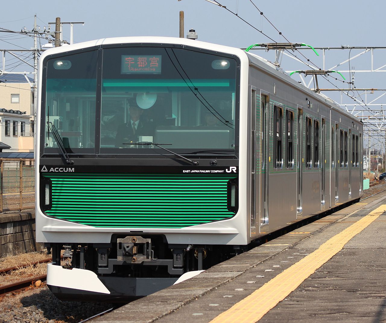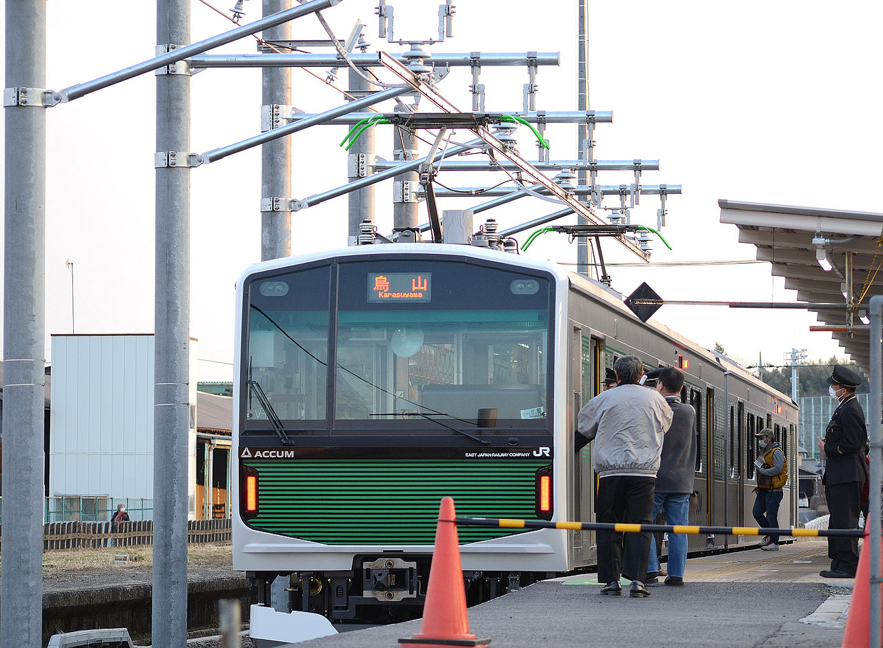 Японский контактно-аккумуляторный электропоезд EV-E301 series 2014 года, создан для замены устаревших дизель-поездов на местной линии Karasuyama. Следуя по основной электрифицированной магистрали, двухвагонный электропоезд питается напряжением 1500 V DC и заряжает аккумуляторы. Местную не электрифицированную линию, длиной 20 км, проходит на заряде батарей, на конечной станции установлена токоведущая шина (под штатные пантографы) для быстрой зарядки батарей (вариант жд электробуса). http://www.youtube.com/watch?v=dGOh4LHxkX0