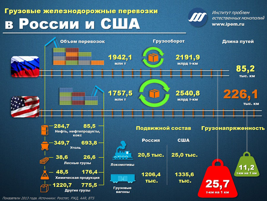 Любопытная сравнительная инфографика Россия vs USA. Смотрите, объем и интенсивность перевозок по ж/д в России выше, а грузооборот ниже. Это потому, что американские компании гоняют свои частные вагонные парки по дальним маршрутам, и им проще гнать свой вагон далеко, чем брать в аренду чужой на месте. Что касается длины сети, то нынешняя американская цифра лукава: туда вошло множество полузаброшенных линий, по которым давно не ведётся движение. Реально там протяжённость "живых" линий примерно эквивалентна, где-то между 80 и 100 тыс. км.