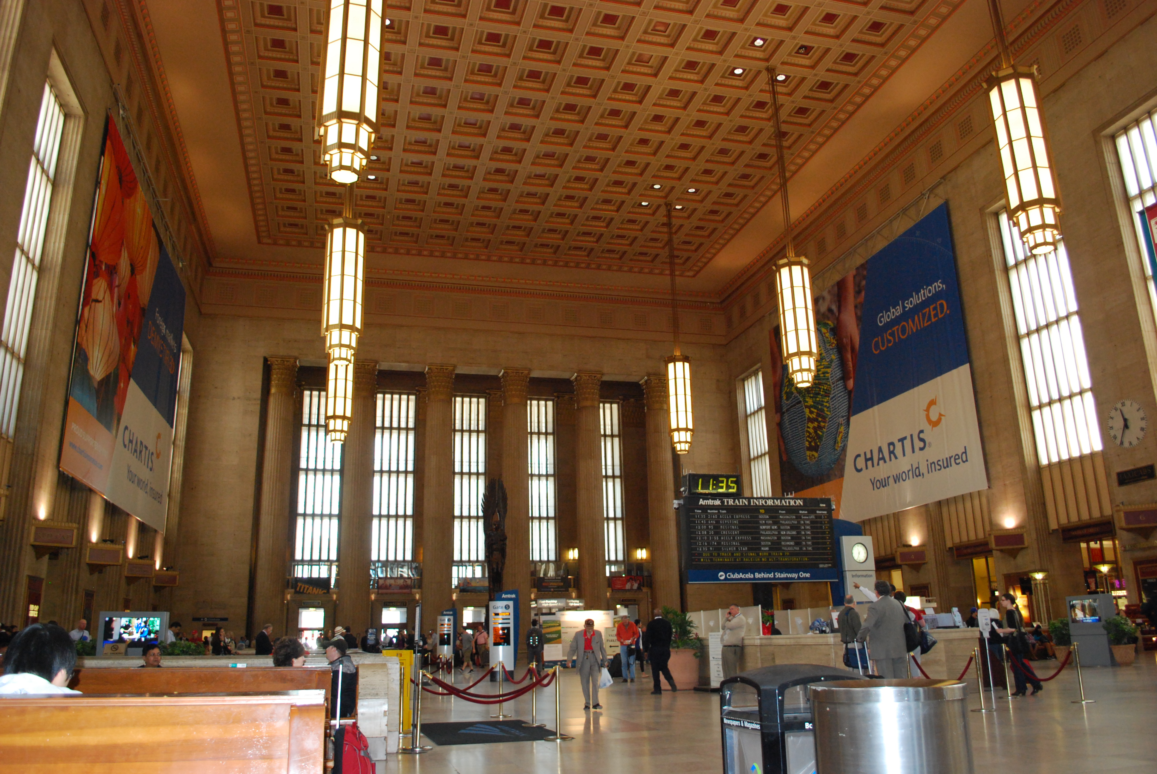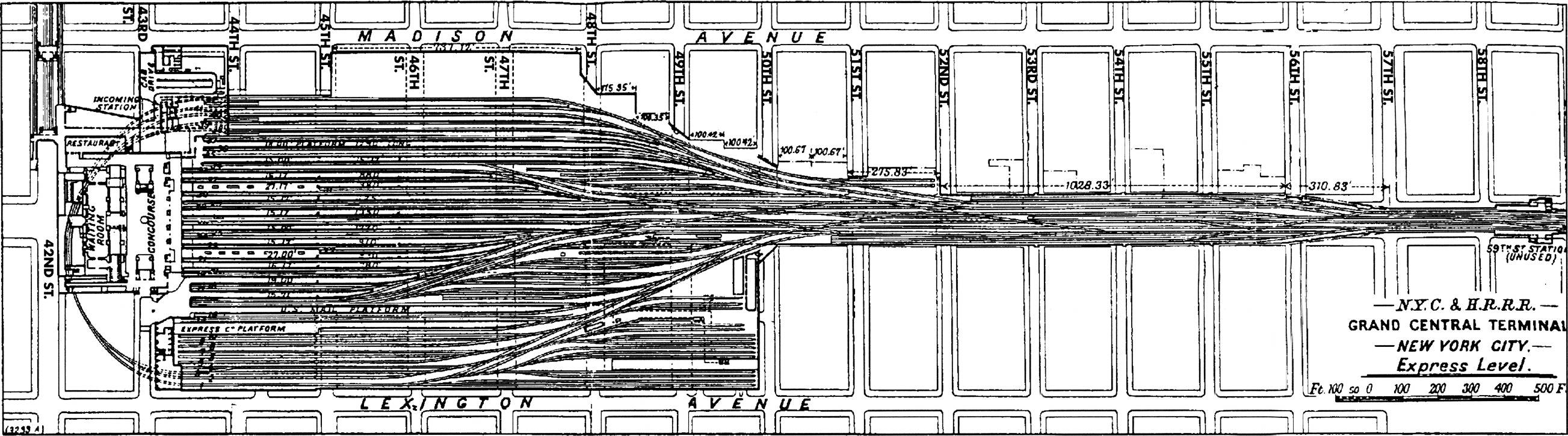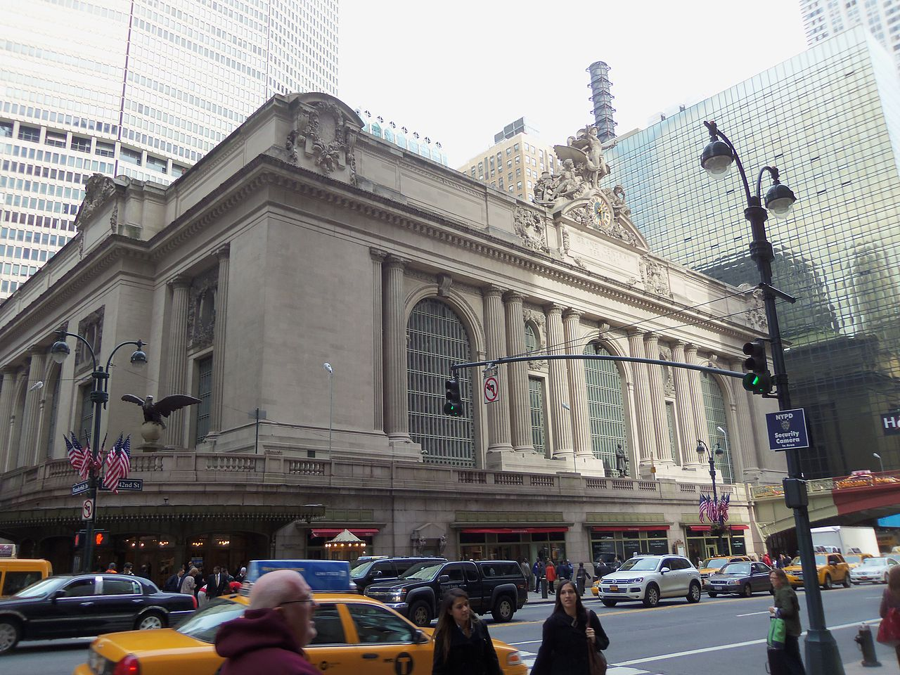- Центральный вокзал (англ. Grand Central Terminal, неофициально также Grand Central Station) — старейший и известнейший вокзал Нью-Йорка. Расположен в среднем Манхэттене на пересечении 42-й улицы и Парк-авеню. По числу платформ 44 и путей 67 превосходит любой другой вокзал мира. Это грандиозное инженерное сооружение, вся транспортная инфраструктура - все пути и пассажирские платформы находятся под землёй на двух уровнях - на верхнем уровне располагается 41 путь и 26 путей на нижнем. Но самая диковинная вещь в том что пути и на верхнем и на нижнем уровнях имеют разворотные петли! Да да, длинные железнодорожные составы можно разворачивать как разворачивают трамвайки на кругах (в наше время это неактуально, но когда поезда тянули паровозами это было очень кстати). И такой грандиозный вид вокзал приобрёл в 1913 году, старый вокзал на этом месте был построен ещё в 1871 году.