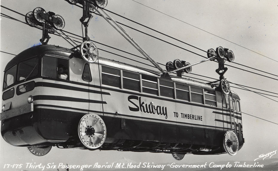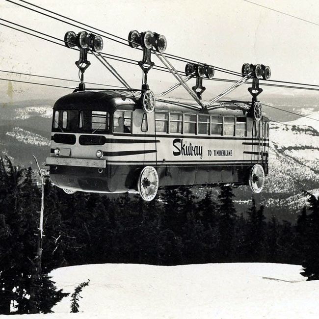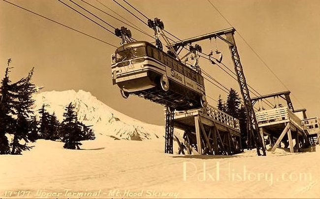 - в течение десяти лет над горой Hood в штате Орегон летали вот такие вот тросовые автобусы. Причем, прошу заметить: это не банальные кабинки, болтающиеся на движущемся тросе, - это самостоятельно двигающиеся по тросовому пути моторные вагоны. Skiway Cloudliners - автобусы, летящие над головой.