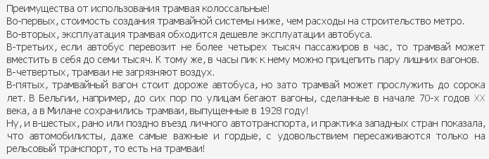 А если честно, я случайно услышал его проклятья в адрес трама, впрочем там был новориш борец с бедностью уровня: "давайте уберем налог на богатых и введем повышенные на бедных, так бедным быть будет не выгодно", так что скорее всего он так и думал.