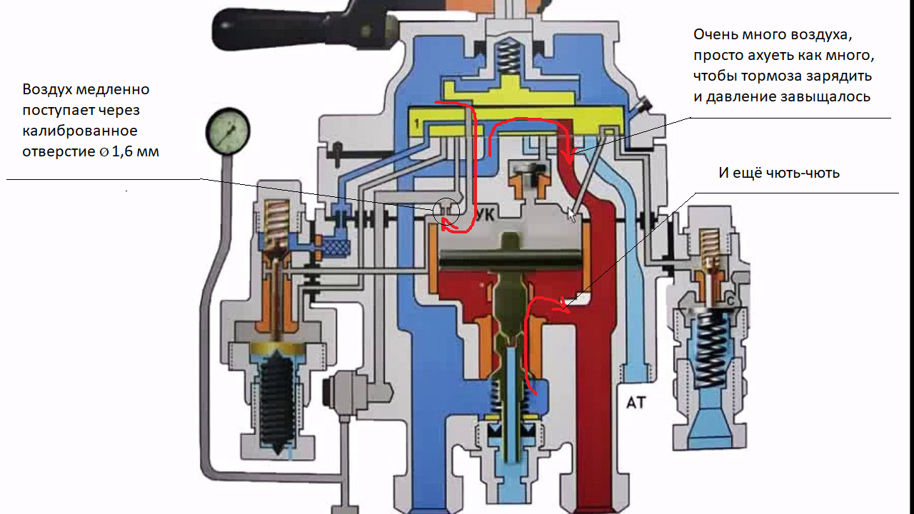 >>70763 >В чём суть завышения при отправлении на грузовых поездах? Таким нехитрым способом можно проверить примерную длину тормозной магистрали /ТМ/. При длине ТМ более 20-30 условных вагонов воздух будет уходить в хвост поезда, а при меньшей длине через кран машиниста /КМ/ в атмосферу. Соответственно, если в справке о тормозах и ДУ-1 нарисованно 69 вагонов, есть о чём задуматься. Для верификации советую провести натурный эксперимент, завысить на одиночном локомотиве, а потом в поезде. Теоретические познания укладываются в голове лучше, когда когда с ними работаещ своими руками. Скучное рассщиренное пояснение работы КМ 394: Управлять поездом с длинной ТМ методом прямого сбрасывания воздуха в атмосферу весьма затруднительно, по этой причине КМ 394 управляет в давлением в ТМ через уравнительный резервуар /кроме I, VI положений/, фактически машинист управляет давлением в УР, а КМ автоматически воспроизводит действия машиниста в отношении всей ТМ. Ещё с транзистором вот можно сравнить, ну типа управлять маленьким объёмом куда проще. Вот только в I положением РКМ ТМ питается сразу из питательной магистрали, тогда как УР через калиброванное отверстие малого диаметра. После постановки РКМ во II положение КМ автоматически восстанавливает давление в ТМ до зарядного. А в это время, оказывается что давление в УР меньше, воздух из питательной магистрали больше не поступает не в ТМ не в уравнительную камеру. Соответственно уравнительный поршень под давлением воздуха в ТМ поднимается в верх, чем открывает атмосферный канал, и воздух из ТМ начинает утекать в атмосферу, до тех пор, пока давление в уравнительной камере и, соответственно, в УР, не сравняется с давлением в ТМ. А при высокой длине ТМ и её низкой плотности воздух будет уходить в атмосферу через дырявые воздухопроводы вагонов. И, если, воздух выходит в атмосферу через КМ в грузовом поезде, есть о чём задуматься, может там под воздухом мало осей, скажем всего 4, из-за того, что концевые краны перекрыты или пробка ледяная, какая есть. Аналогичную проверку проводят после Продувочки. После проверки целостности ТМ и свободности прохождения воздуха по ней, давление в ТМ и УР падает весьма сушественно. Во II положении РКМ воздух из питательной магистрали поступает через питательный клапан редуктора в полость над уравнительным поршнем. А из этой самой полости по уже знакомому нам калиброванному отверстию диаметром 1,6 мм воздух поступает в УР и в редуктор с другой стороны, причем стремится закрыть этот самый питательный клапан редуктора через металлическую диафрагму с пружинкой с другой стороны от питательного клапана. Но т.к. давление в полости над уравнительным поршнем и в УР низкое, а поступает в УР и редуктор воздух через калиброванное отверстие, то воздуху ещё долго не удаётся перекрыть питательный клапан самому-себе. И в то же время воздух проталкивает уравнительный поршень вниз, открывается канал для поступления воздуха из питательной магистрали в ТМ, причём поступление воздуха в ТМ происходит гораздо быстрее чем через калибровочное отверстие. При небольшой длине ТМ давление в ТМ успевает поднятся заметно выше чем в УР, прежде чем уравнительный поршень переместится в равновесное положение. Также проверяют, что сигнализатор 418 на продувочку сработал, а после выдержки не менее чем 2-х минут и пос