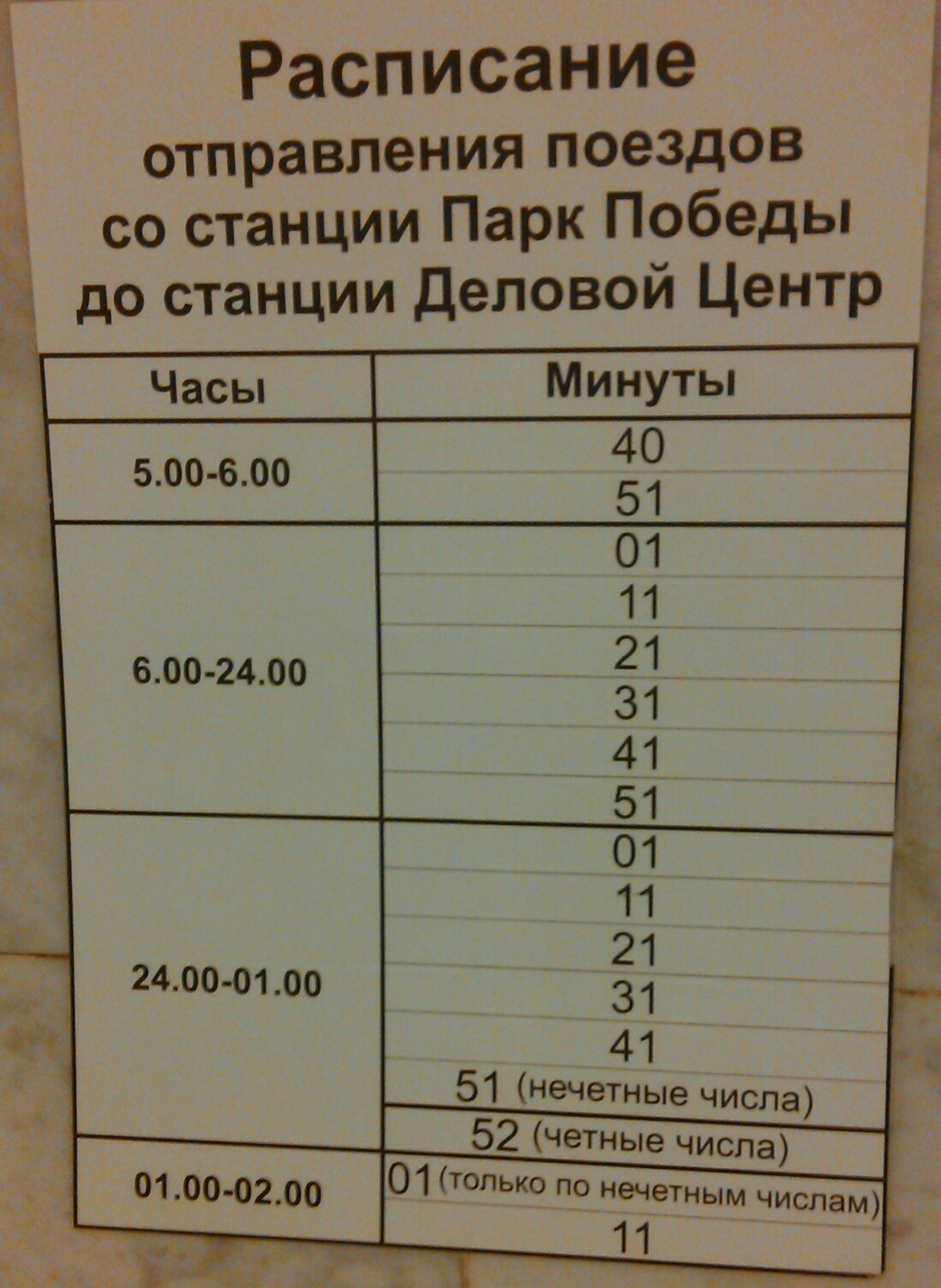 >>71026 Для пассажиров в метро, как правило, доступно только время начала и окончания работы, что конечно не расписание, но бывают и исключения - пик 1. А вот для служебного пользования, там у каждого машиниста, в каждом поезде находящемся на линии есть прямоугольной формы бумажка (плотная такая, почти картонка) на которой указаны № поезда (маршрут), перечислены все станции линии, и время прибытия на каждую станцию - час, минута, секунда. На каждую ездку - от конечной до конечной - своя отдельная бумажка, пик 2.