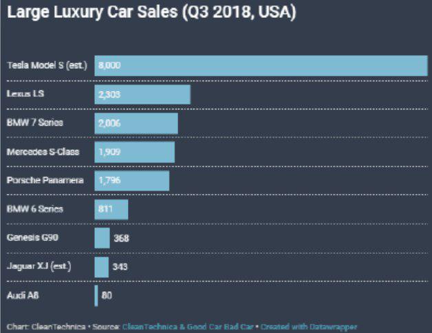 В минувшем месяце Tesla передала американским клиентам 21 800 электрокаров против 16 060 легковушек у Audi. Правда, Mercedes (31 720 реализованных автомобилей) и BMW (23 260 штук) пока остаются впереди, равно как и Lexus (22 720 проданных машин в октябре).