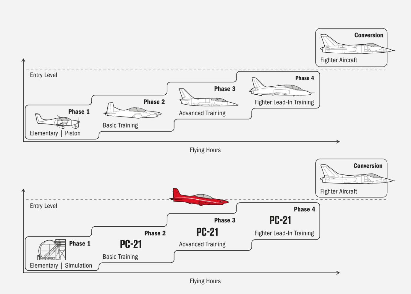 А это че? First flight of the PC-21 prototype was in July 2002 and full certification was achieved in December 2006. This certification was to Swiss CS-23 Regulations (fully harmonised with EASA-23) governing light commuter-type aircraft. Individual Swiss military certification additions such as ejection seats have been applied as appropriate.