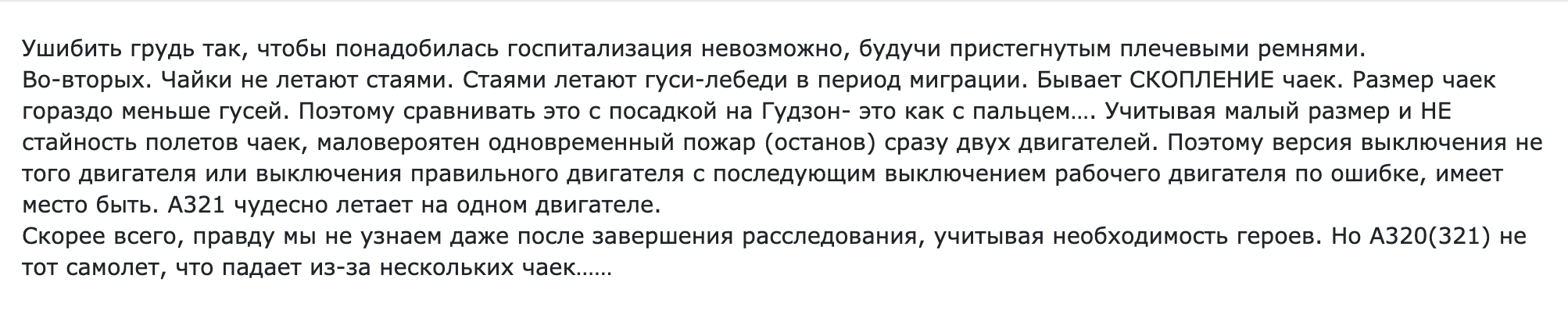 Лолирую, на форумавиа уже 22 страницы насрали, все бомбанули со звания героев обоим пилотам. Естественно вата радуется, пилоты скептичны. Моя версия событий - взлетели на несколько десятков метров, ебанул один движок, они обосрались что второй не вытянет и вообще забили на все процедуры, а перед ними чистое поле мягкой кукурузы, и решили от греха подальше прикукурузиться. Но буду рад ошибиться. Но все таки, какова вероятность выхода из строя обоих двигателей? Плюс это были чайки, а не здоровенные гуси, как в случае с салли.