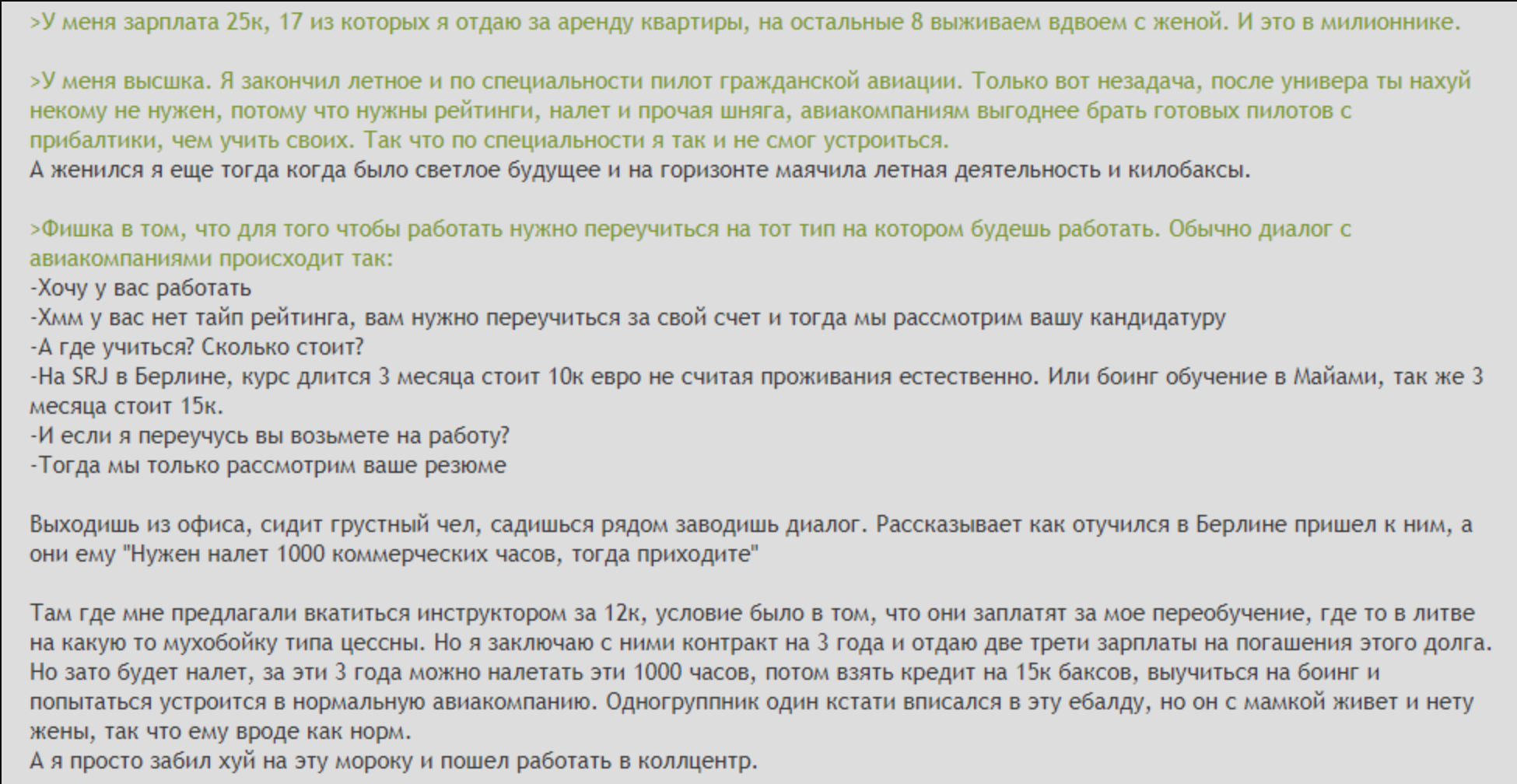 И ты походу перепутал, речь идет о airbaltic в литве. >Продает все имущество и поступают в какое нибудь Сасовское? Нет, ебутся с валидацией, потом ездят по всей стране и предлагают свои жопы, и в 1 шансе из 50 им повезет. Ну либо идти в хуясово, выше писал, фактически это тюрьма. Тут недавно рассказывали как они летают, так там в поле в жару с утра до вечера все сидят и ждут, пока остальные отлетают, поэтому какие-то ебучие разборы и тд.