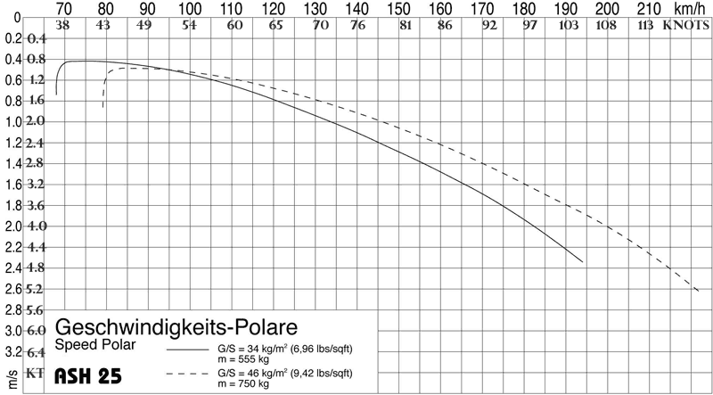 > Планер ASH-25: > Rate of sink: 0.42 m/s > Maximum glide ratio: ca. 60:1 V @min sink: 0.42·60 = 25.2 m/s = 49 knots