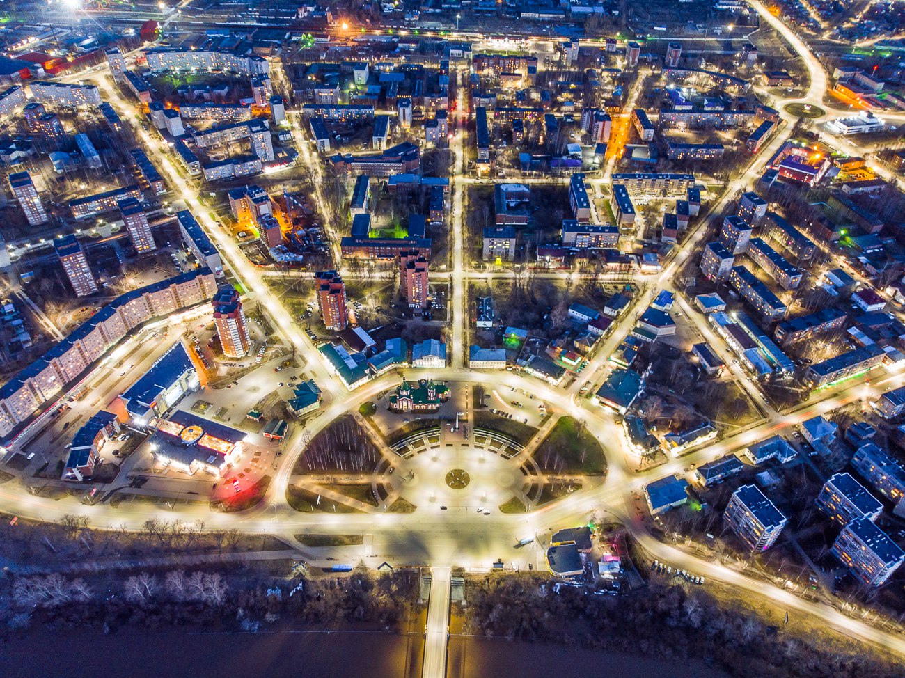 центром города является площадь Свободы. Планировка центра - радиально-кольцевая. По фотографии если смотреть: на лево - новый район; на лево-вбок - зона торговли, выход к Мебельной фабрике; Прямо - выход к вокзалу (там где зелёные огоньки - станция Глазов, сам вокзал - ярко-белый с краповой крышей, чуть правее дороги; лево-вбок - район свободы до кольца, за кольцом - путепровод через железную дорогу в район Металлиста, там на лево - на Реммаш, на право - на 9-ку, где УЗСМ и дальше - Птицефабрика; лево - старый город, культурно-деловой центр, а если очень далеко идти - Химмаш; лево-чуть назад - Швейная фабрика, Глазовский ЛВЗ, ЧМЗ; назад - мост через р.Чепцу - вон и прочь из города.