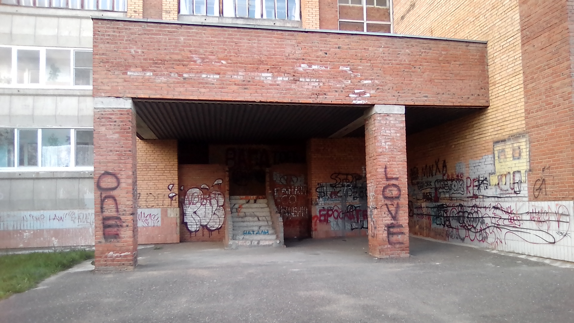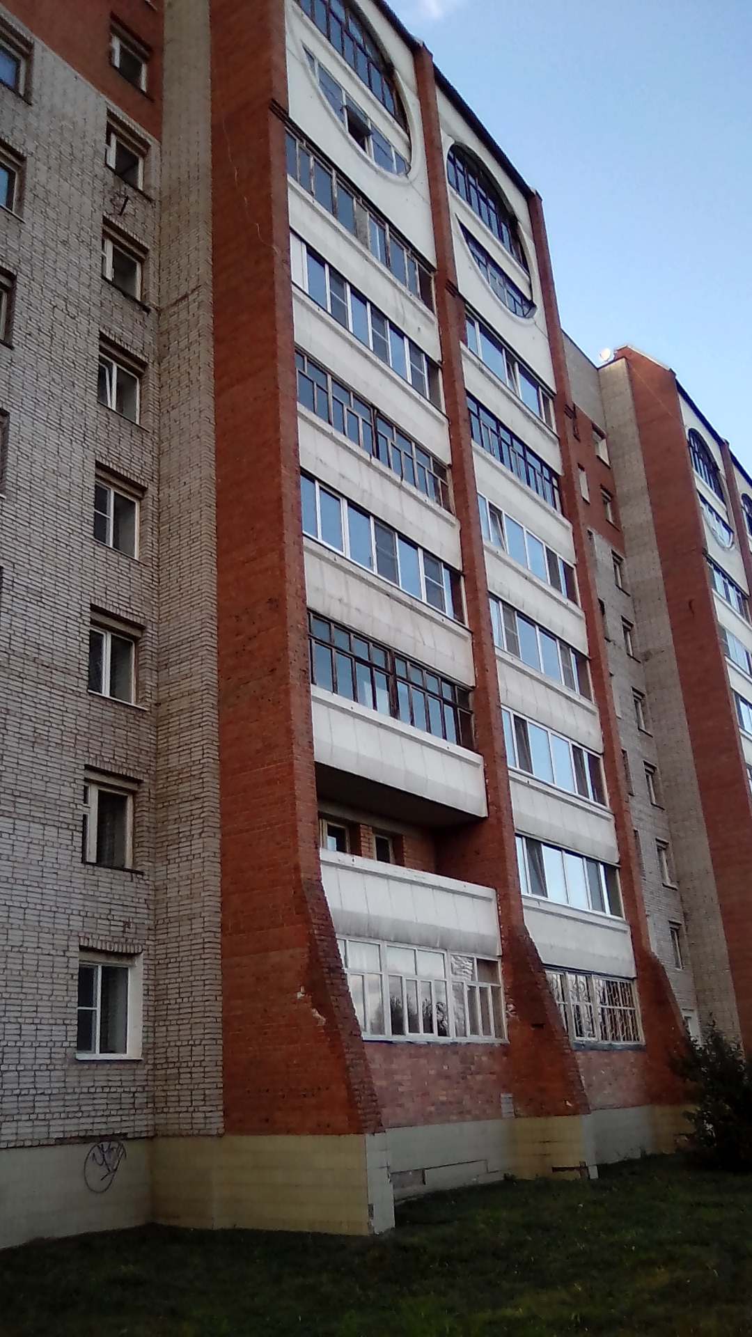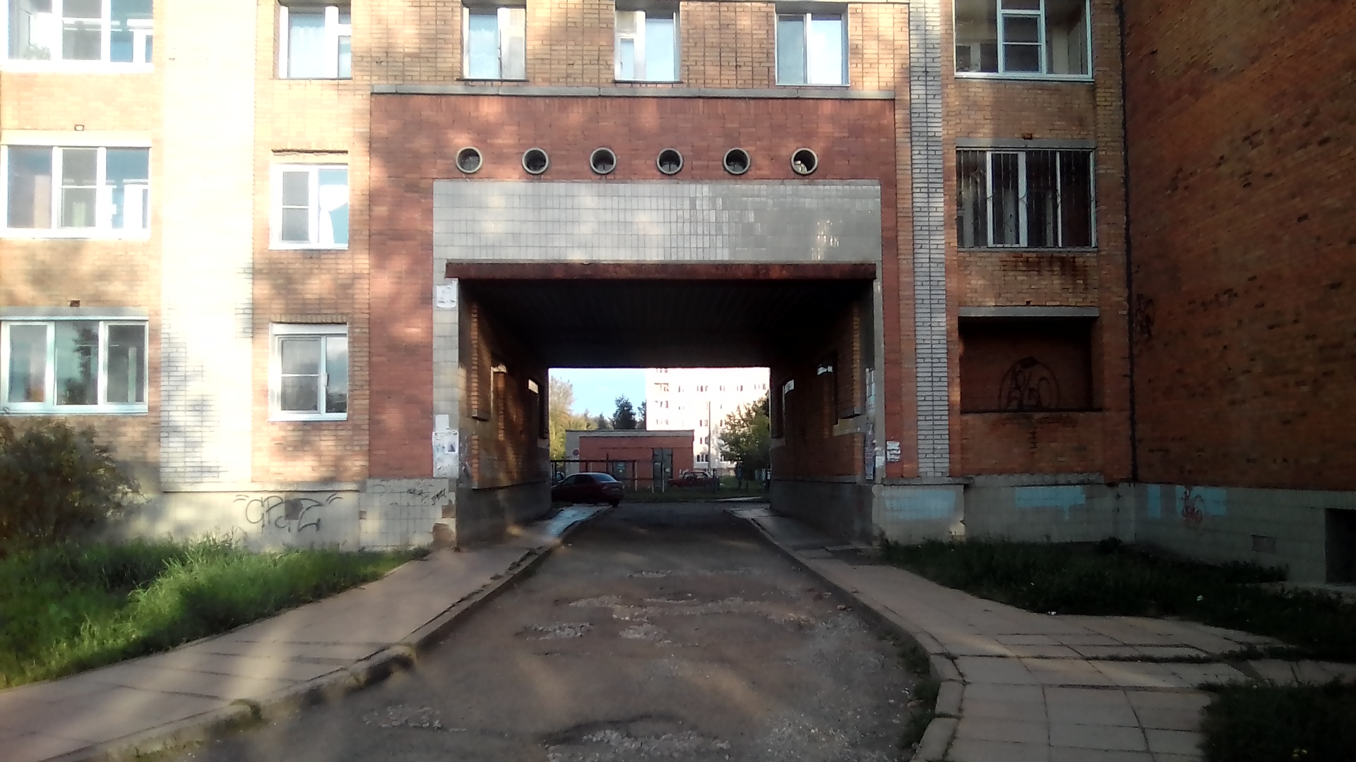 посмотрим как устроен т.н. новый район. Прежде всего тут почти в каждом дворе баскетбольная площадка как в чёрных гетто США. а где-то сразу две площадки. Это не кирпичный забор на первой. там просто перепад высот это уровни разные, это декоративный забор между уровнями - один из элементов авангарда (излишество), при этом свободный проход сохраняется. Даже при том что дома строил стройбат по типовым проектам ускоренным темпом это не спасало от изобретения Пехтиным всевозможных излишеств: полукруглые балконы, разноуровневая крыша с одной квартирой на последнем этаже, или хотя бы кирпичные панно на стенах домов (вторая картинка). обычно изображалась цифра нуль - половина от символа бесконечности, или как называл эту цифру сам Пехтин - зерро (вторая картинка). Зерро присутствует и в шароёбских конструкциях балконов верхних этажей (третья). Ну а нижние этажи изобилуют выступами под клумбы, непонятными входами в подвальные помешения, часто приспособленными под магазины или вот техническими подездами, как на третьей картинке, приспособленными под общественный туалет, тоже изобилующие безсмысленными малыми архитектурными формами