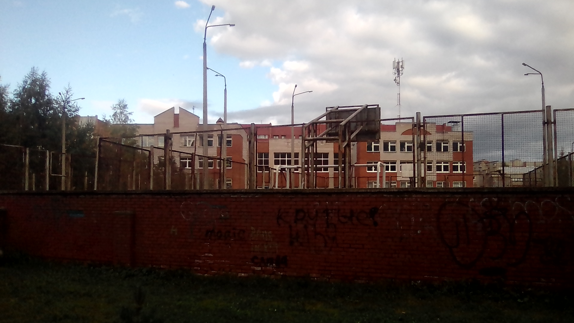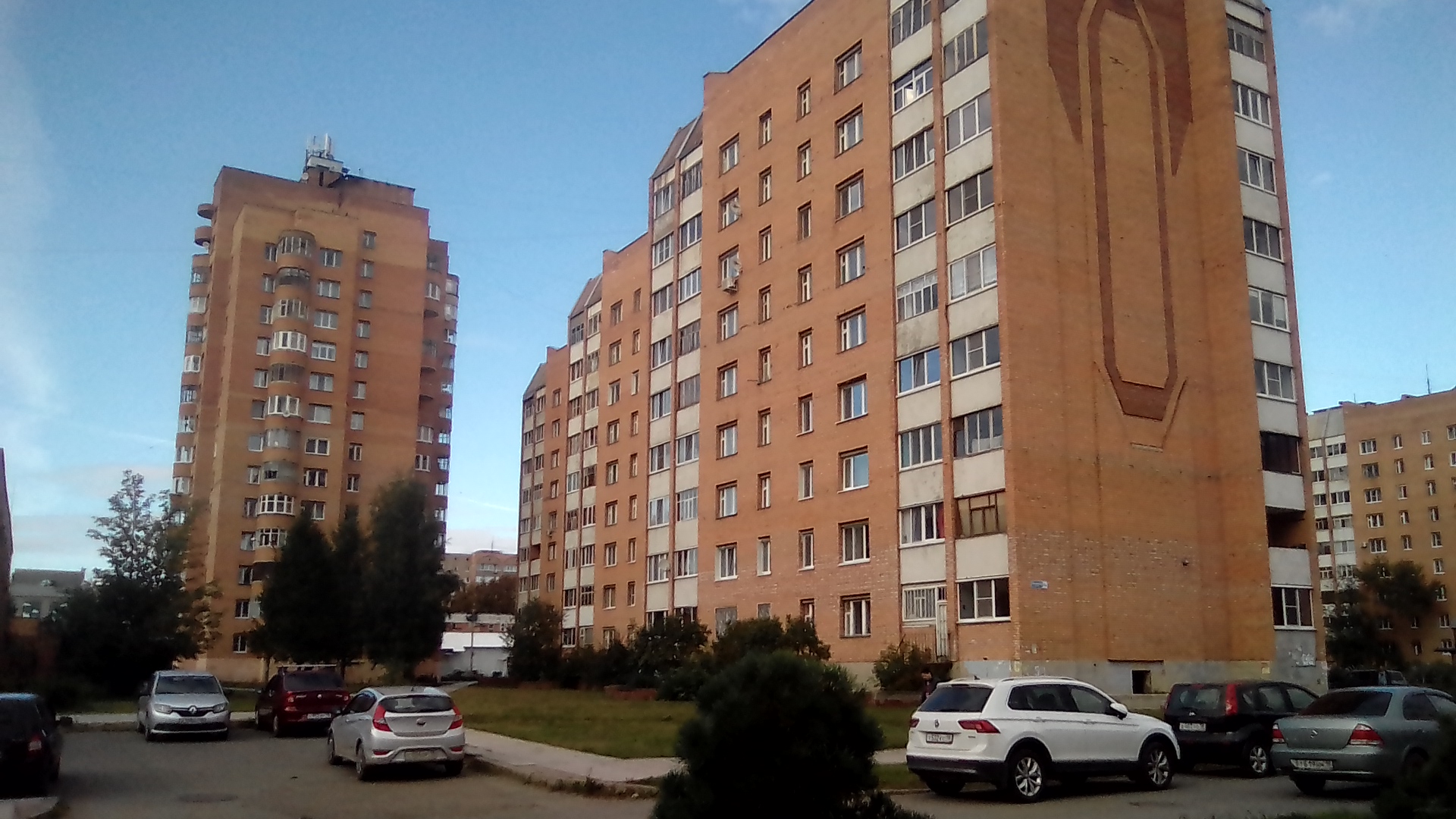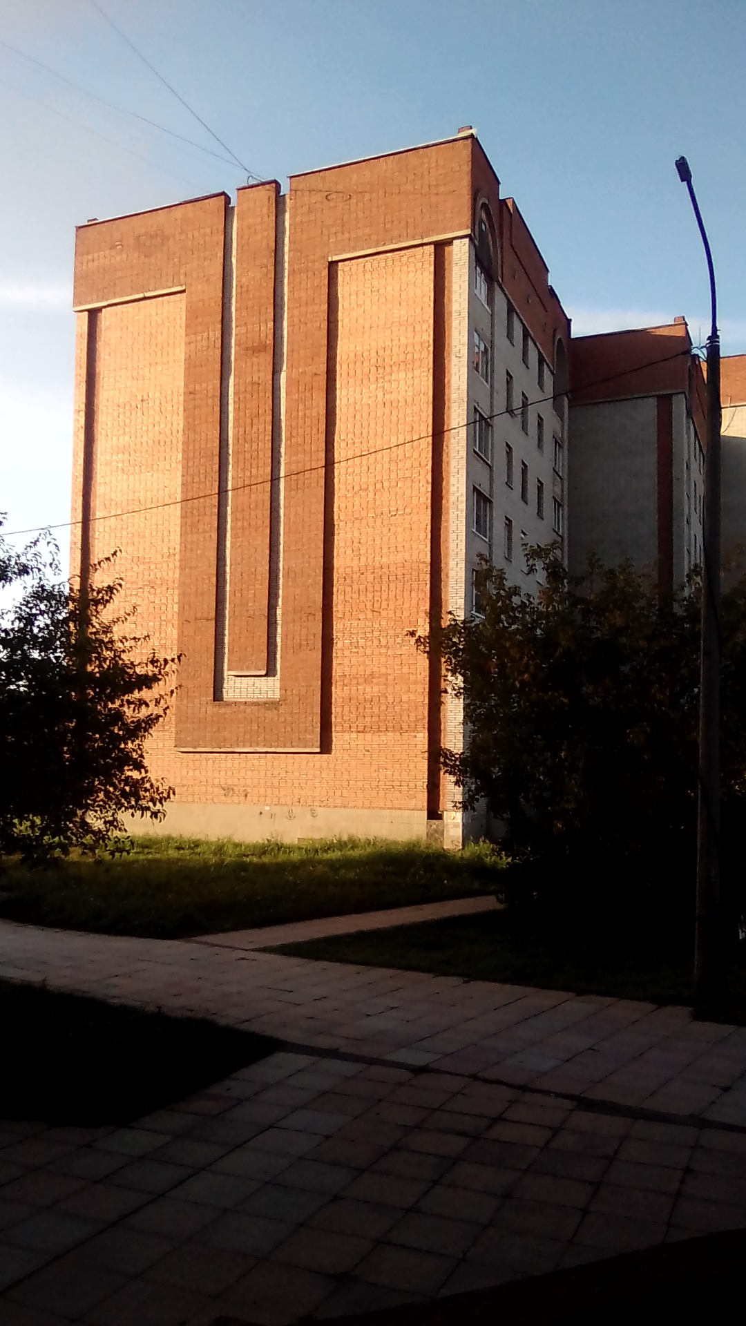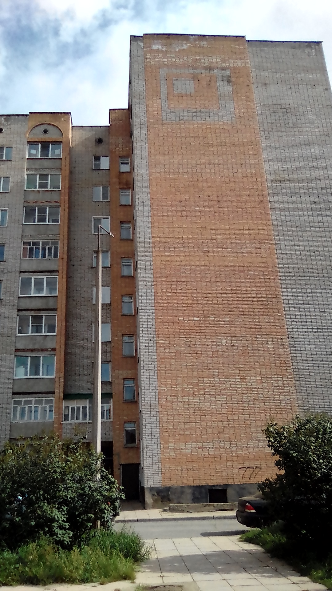 посмотрим как устроен т.н. новый район. Прежде всего тут почти в каждом дворе баскетбольная площадка как в чёрных гетто США. а где-то сразу две площадки. Это не кирпичный забор на первой. там просто перепад высот это уровни разные, это декоративный забор между уровнями - один из элементов авангарда (излишество), при этом свободный проход сохраняется. Даже при том что дома строил стройбат по типовым проектам ускоренным темпом это не спасало от изобретения Пехтиным всевозможных излишеств: полукруглые балконы, разноуровневая крыша с одной квартирой на последнем этаже, или хотя бы кирпичные панно на стенах домов (вторая картинка). обычно изображалась цифра нуль - половина от символа бесконечности, или как называл эту цифру сам Пехтин - зерро (вторая картинка). Зерро присутствует и в шароёбских конструкциях балконов верхних этажей (третья). Ну а нижние этажи изобилуют выступами под клумбы, непонятными входами в подвальные помешения, часто приспособленными под магазины или вот техническими подездами, как на третьей картинке, приспособленными под общественный туалет, тоже изобилующие безсмысленными малыми архитектурными формами