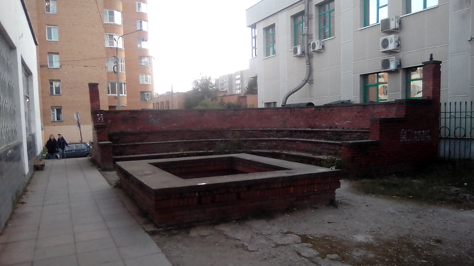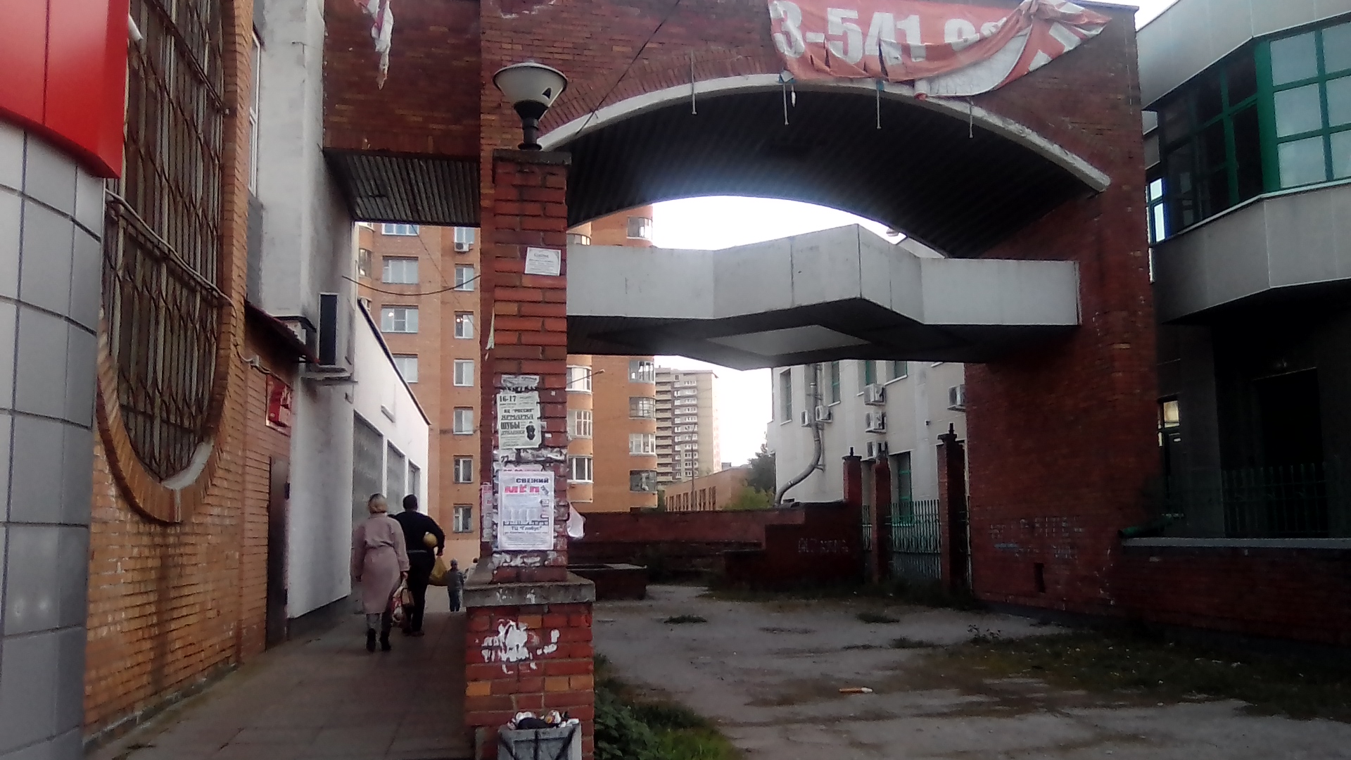 Зона торговли у площади Своды. вот это построили в перестройку в 80-е. и скорее всего стройбат который строил новый район. почто следы их деятельности встречаются по всюду. вот эти вот кирпичные столы спроектированы как прилавки для торговцев набиравшего в то время кооперативного движения. а цокольные и подвальные помещения дома изобилуют лабиринтами торговых павильонов. не так давно ещё в этом месте торговый комплекс поставили.