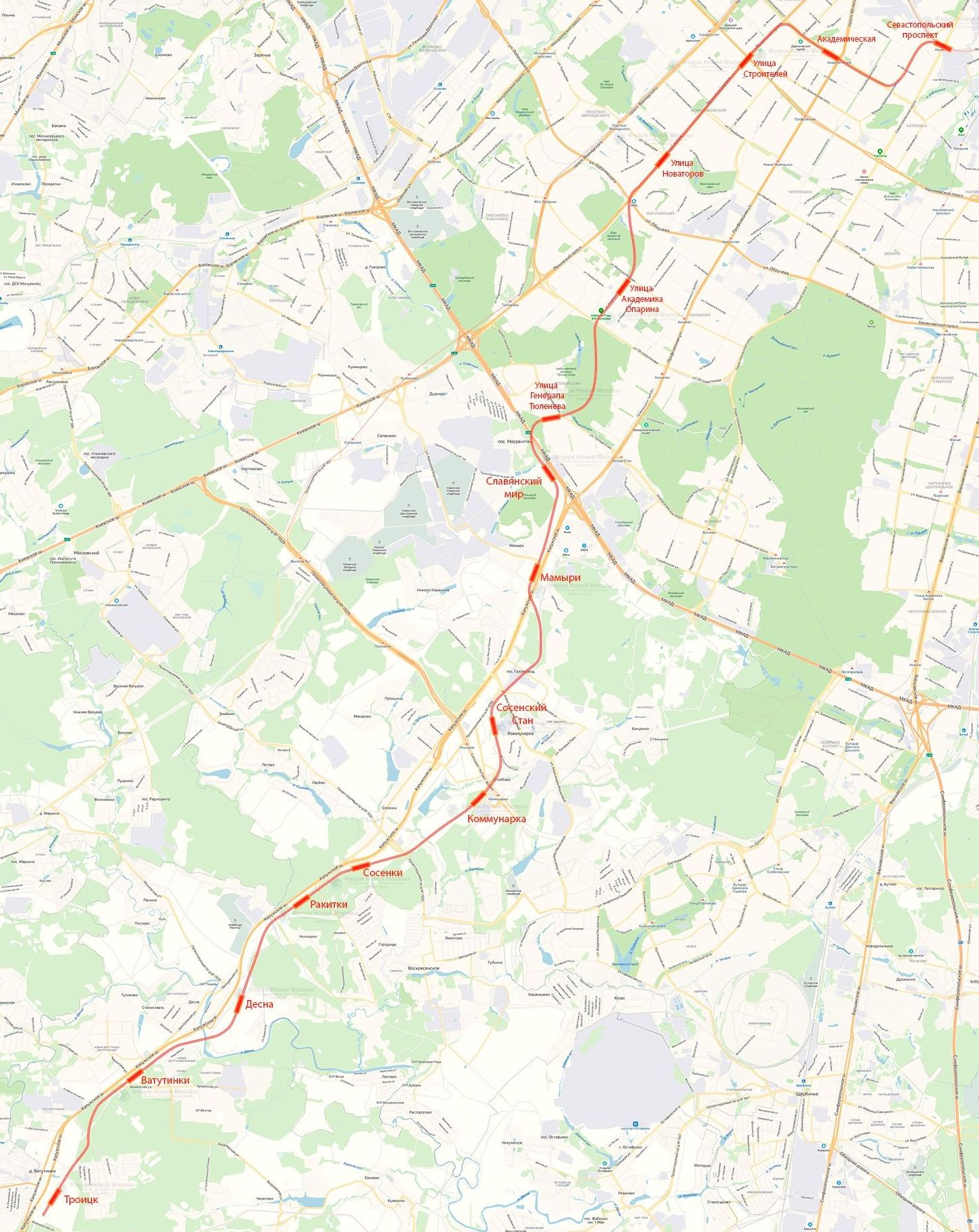 Вот, скажем, от Троицка до Тёплого стана. 20 км всего. Пустить скоростной рельсовый автобус - и будет условно 15 минут в пути. Инвестиции вполне подъёмные. Вопрос только в том, можно ли будет это легализовать?