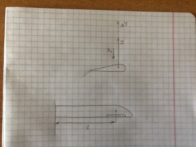 Итак, почему у планера скорость изменения крена ниже? Потому что, в первую очередь, это обусловленно факторами, обеспечивающими именно прирост подъёмной силы. Можно увеличить ее, увеличив отклонение и площадь закрылков. И, если бы планер был изготовлен из абсолютно жесткого, не работающего на изгиб материала, он бы крутил бочки с какой угодно скоростью. Но материал у него не идеальный, и только тут и вступает в силу удлиннение: за счет малой длины хорды крыло более хрупкое, а за счёт большой длины консоли момент силы гораздо выше (плечо обозначено как l на схеме). Увеличим прирост — крыло отвалится. Но, если бы не отвалилось, планер бы быстро вертелся.