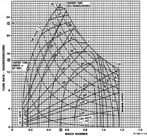 Т.е. самолет на оптимальной дозвуковой скорости (она разная и зависит от модели самолета) будет выполнять вираж быстрее и с меньшей перегрузкой, чем тот же самолет на трансзвуковой или сверхзвуковой скорости с максимальной перегрузкой. Т.к. радиус и время виража зависят от скорости и высоты для каждого типа они выражаются с помощью кривых на графике (см. картинки).