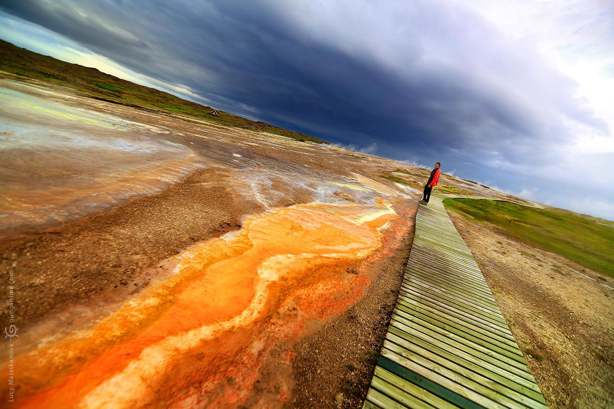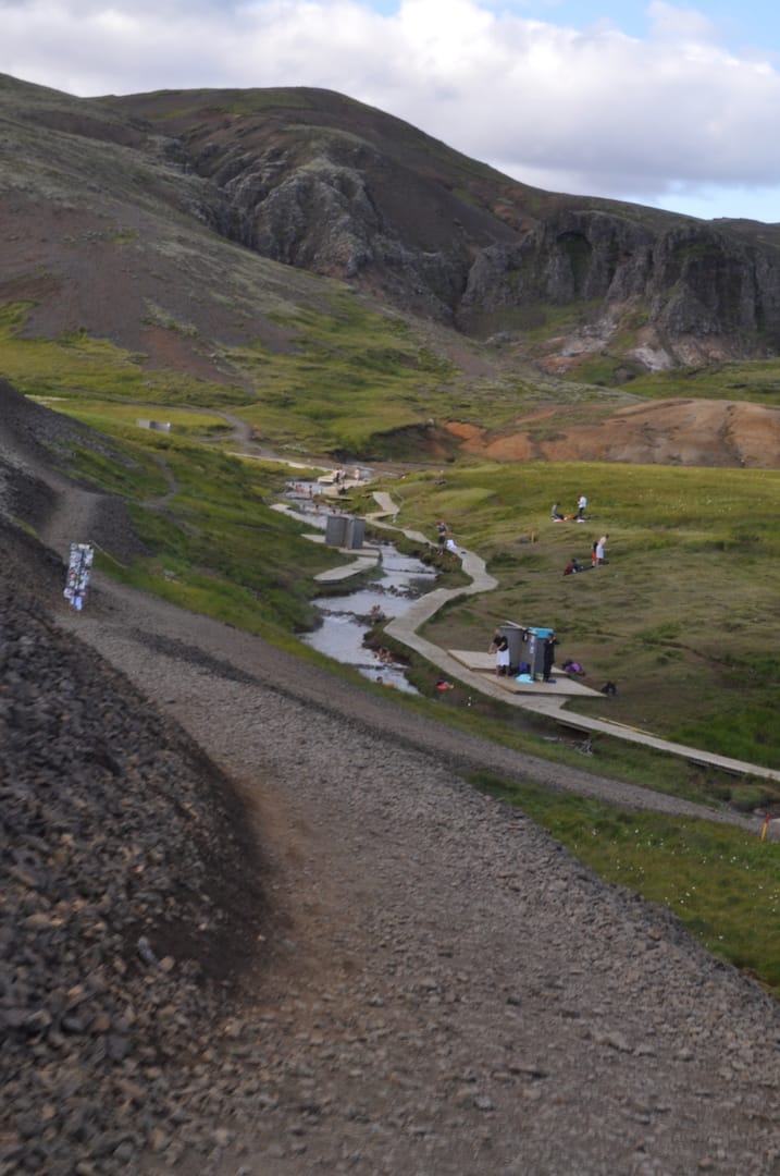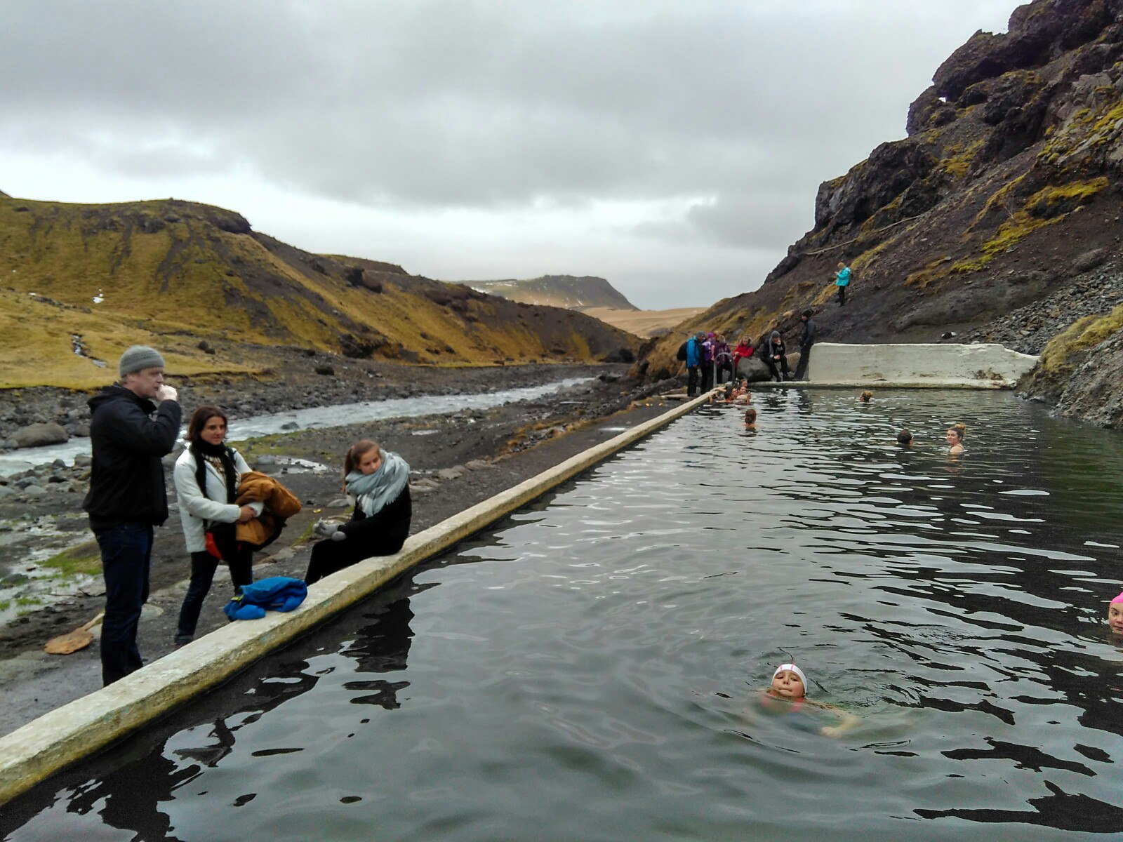 Вставайте на главную дорогу (№ 1) — это кольцевая дорога Исландии, которую выбирают все путешественники, чтобы увидеть весь остров. Лучше вставать у автозаправки — это наиболее удачное место, чтобы словить машину. Согласно рейтингу Global Peace Index 2015, Исландия — самая безопасная страна в мире, так что истории про водителей-маньяков можно забыть. Помимо того, что, путешествуя автостопом, вы не потратите ни копейки (плату за бензин исландцы не принимают и удивляются подобным предложениям), у вас будет возможность ближе пообщаться с местными жителями. Нас с подругой подбирал дайвер из Хверагерди, инженер и психиатр из Рейкьявика, пожилая пара коренных исландцев, влюбленных в петербургские театры, бывший игрок национальной сборной Исландии по гандболу, рыбак со слюнявым лабрадором Нельсоном на заднем сидении. В общей сложности — около 12 жителей этой удивительно открытой страны. С некоторыми водителями мы вместе заезжали навестить их родственников по пути. Исландцы рассказывали о местах, которые они любят посещать, и которые вряд ли можно найти в путеводителях. Одно из таких мест — горячая река у городка Хверагерди, примерно в 40 километрах от Рейкьявика. Чтобы бесплатно искупаться в купальнике и вязаной шапке, придется пережить 12 километров добротного хайкинга.