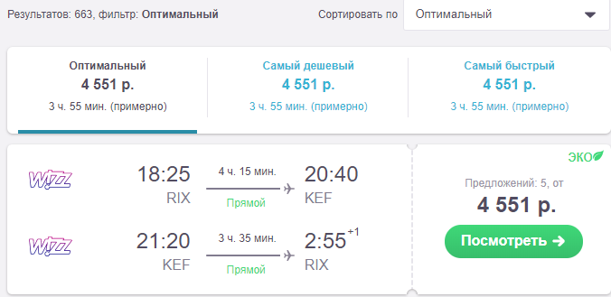 Рейкьявик, Исландия (все аэропорты) – Рига, Латвия (RIX) 21:30 → 04:10+1 по ср и вс