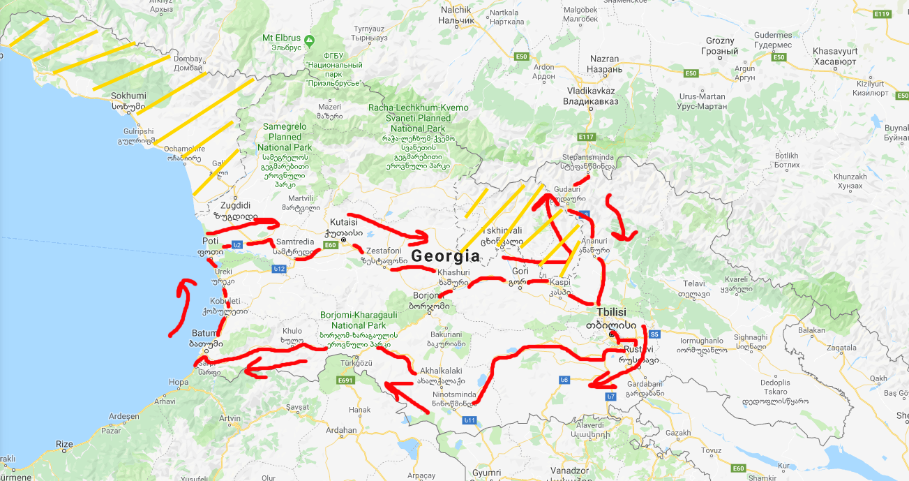 >>48266 Пример маршрута. Рыжие полосы - оккупированные территории, въезд с территории которых мгновенно кончится выдворением из страны с волчим билетом на 3-5 лет.