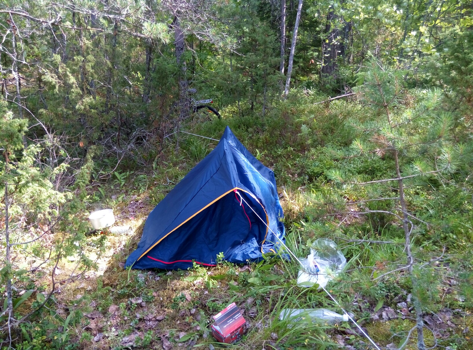 Спал вот в такой палатке. Всегда, за исключение одного раза располагался у воды, чтобы купаться, мыться, подмывать жеппу и чистить зубы. Палатка одноместная и компактная, поэтому при желании можно хоть на скале поставить, лишь бы было пару клочков земли для нагелей. Внутри пенка и спальник. Все время высыпался, ни разу не спал больше 8 часов. Что странно, первый день дома на кровати спалось хуево.