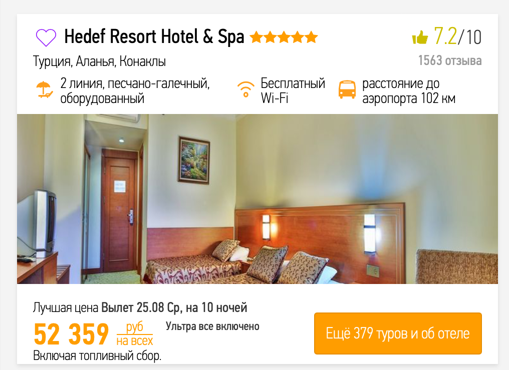 >>45295 Травелата скачай приложение на телефон и покупай тур. Я так там выбрал тур , но очканул оплачивать, в итоге поехал в офис библио глобус в нашем НСК и купил тур у них , что сука характерно у них тур стоил на 1к дороже чем в приложении травелата . Через 10 дней я снова чекнул стоимость отеля на нашу дату по этому приложению и блять у сунмар появилась скидка в 15% на эту дату блять , в итоге я отдал библио 86к за 11 ночей в Гранд Парк Кемере 5* . А мог бы подождать 10 дней и купить в сунмаре за 75 бля (((( ну похуй кто же знал что так будет , поэтому чекай через приложение , по-моему очень удобное . А в этом году в этот же отель цена от 100к , че за блядство