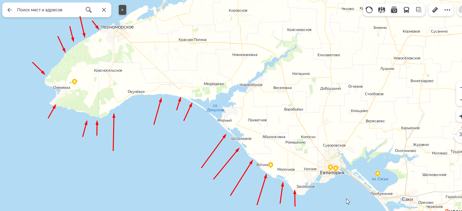 А вообще советую где-нибудь за Евпаторией встать (пикрил №2), стрелочками примерно отметил места где можно встать с палатками. Смотри, рядом с деревнями вроде "Витино", "Молочное", "Штормовка", "Мирный" на берегу очень хорошо стоять с палаточкой, там всегда можно найти несколько деревьев, под которые поставишь палатку и будет тебе тенёк, также в этих деревнях есть магазины с вполне приемлемыми ценами на еду и воду, плюсом там редко идут дожди и песчаные пляжи составляют 90% от всех пляжей соответственно (дно равномерное, мягкое, без камней), сам там 2 недели стоял с палаткой около тарелки между молочным и Витино, там есть целое озеро с лечебной грязью, родник, магазины и людям на тебя относительно похуй, никто мешать не будет, в отличие от какого-нибудь Коктебеля, лисьей бухты или Фиолента.