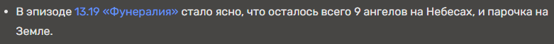 >К концу их там вообще единицы остались И это лютейшая хуитень, высосанная из хуитени Андрюши Дабба, как и то, что якобы от количества живых ангелов зависит сохранность рая с душами. Следим за руками: сначала в сериале демонстрируются демоны как хтоническая хтонь, которую хер завалишь; потом выяснятся дополнительная подробность, что все демоны — это замаринованные адом души, деформированные в паразитов. Затем вбрасывается тупейшая хуйня, что демонов якобы удерживают в мире останки. как призраков: то есть, по этой логике, обработанная душа без останков демоном стать не может? ну тогда пламенный привет сожжённому Дину, которого Аластор сорок лет вербовал невесть зачем. А при сожжении что с демоном должно случиться, опять в душу превратится и вне зависимости от статуса будет, кхм, заново вербоваться? То есть, уже на этом моменте их из разряда хтони низвели чисто до злых колдунов, ну и всю дорогу они после этого ведут себя неотличимо от людей. А самый ахуй случается тогда, когда вместе с элементарной логикой ломается и этот реткон с останками как гарантом присутствия на Земле: то есть, ангелов не станет, рай рухнет, и души заполонят планету, а пресловутое отсутствие останков им никак в этом не помешает, ага. На фоне этого тот факт, что бестелесные ангелы и демоны в не относящихся к Земле раю и аду начали выглядеть и функционировать как свои физические аватарки, уже воспринимается в порядке шизы вещей.
