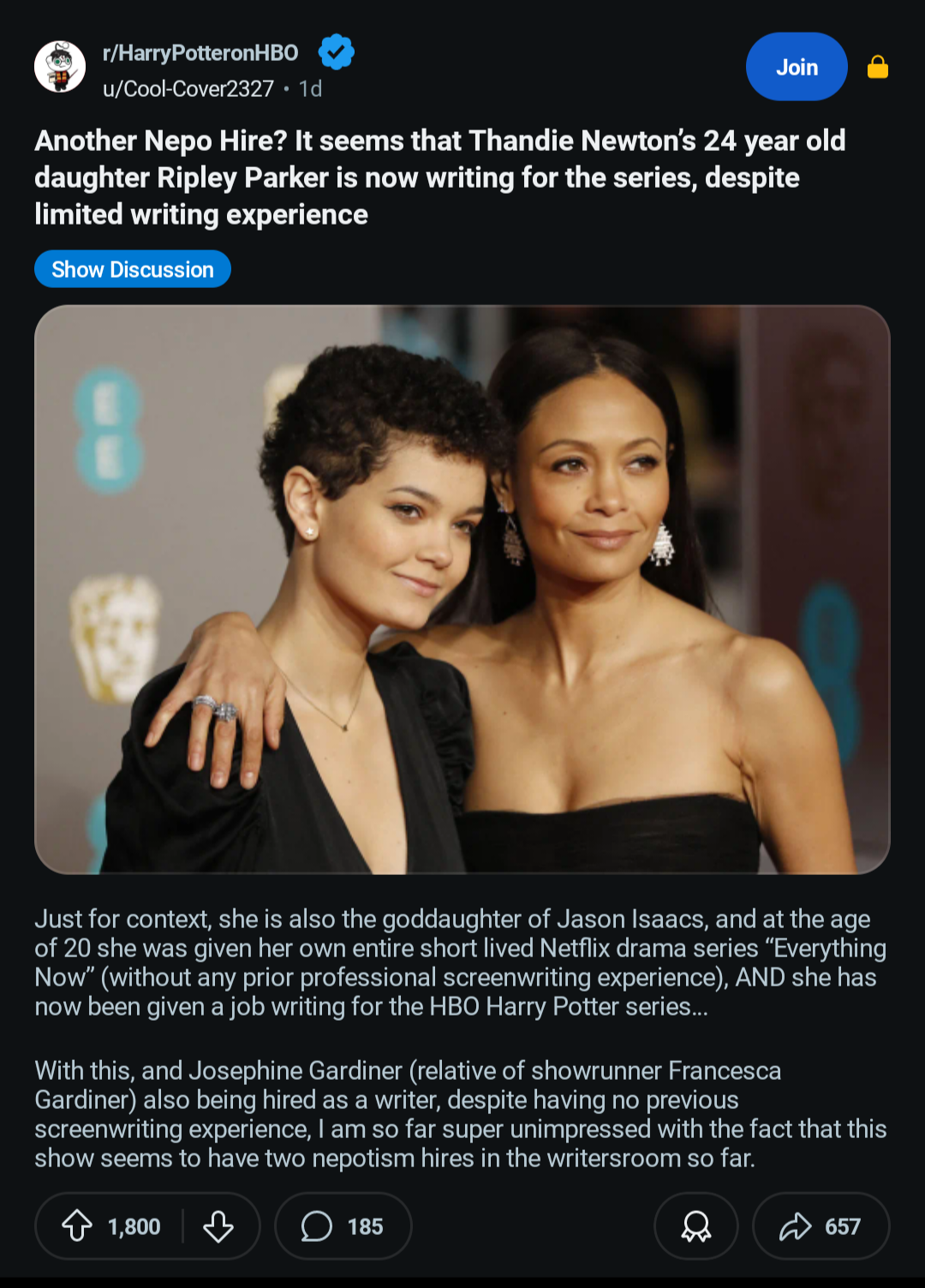 Мне кажется где-то 3-4 книга это будет, когда деньги начнут таять очень быстро. Если фильмы хотя бы снимала старая гвардия, а сценарий адаптировала сама Роулинг, да и в целом она следила за качеством абсолютно всего, а сейчас её вообще послали нахуй. То этот сериал будут делать дегенеративные миллинеалы и еще более тупые зумеры, а на главных ролях полный пиздец -- существа без мозга альфапердиксы. Горючая смесь, все человечество сошлось в этот момент чтоб породить эту говногидру трехголовую.
