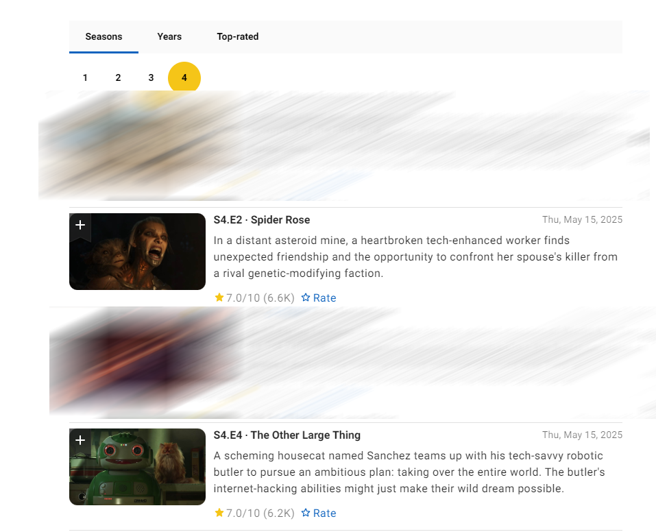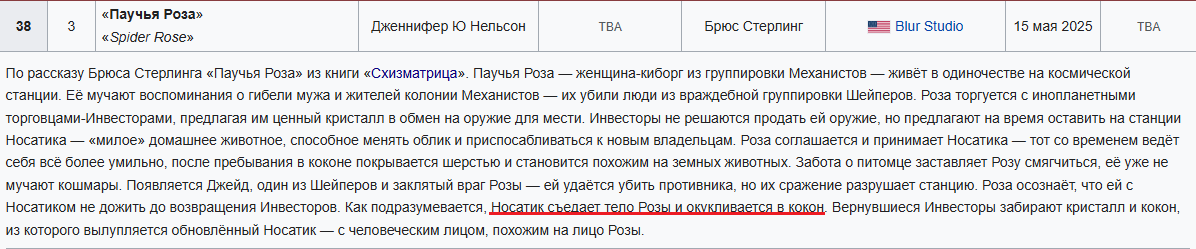 Итак, резюмирую, что сезон откровенно неудачный и слабый, на уровне второго. Там тоже была одна-единственная интересная серия, про бессмертного альбиноса, также с реалистичной 3D-графикой. Здесь мне по-настоящему понравилась только «Spider Rose», хотя к лучшим эпизодам антологии, к сожалению, и ее не отнесу, ибо сюжету не хватило неких остроты и более существенного панчлайна, как в «Разломе» и «Зиме».