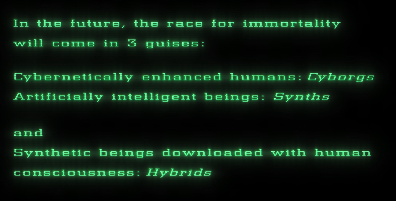 Сюжет разворачивается в антиутопическом будущем 2120 года, где Земля находится под контролем пяти корпораций. Они занимаются разработкой киборгов и синтетиков, которые сосуществуют с людьми. История начинается с того, как корпорация «Prodigy» совершает прорыв при создании гибридов — гуманоидных роботов с человеческим сознанием. Эта технология даёт ей преимущество в гонке за бессмертие, но катастрофа с космическим кораблём «Мажино», который падает на Землю, ставит под угрозу не только амбициозные планы, но и само существование человечества.