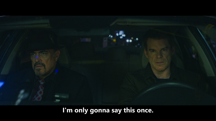 М можно заметить, как несмотря на все эти прошлые сезона, прям с начала Ressurection Декстер начал чуть ли не поворачиваться в камеру и говорить: "Зритель, ну ты так-то не забывай, я психопат, я вообще маньяк полнейший неадекват. Я плохой, я вообще шизан полнейший. Ты больно-то там не фанатей. А то ты зритель плохой будешь. Я - плохо. Декстер - плохо". Я не помню, было ли это в Нью Блад, но по-моему тоже там это обозначали. Это на самом деле очень примитивно литературно и глупо. Будто над сценаристами нет начальника, который бы проводил планёрки и обозначал общие направления и не давал сойти с общих рельс. Плохая организация.