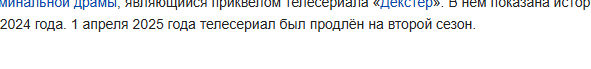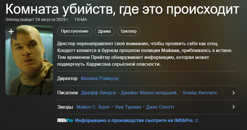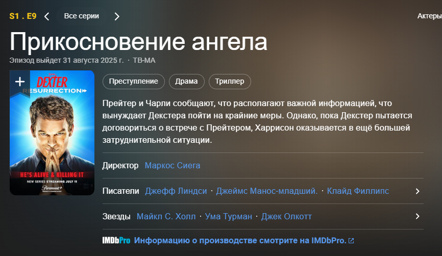 Dexter: Resurrection [2025–...] Top rated TV #29 https://www.imdb.com/title/tt33043892/ Внимание: график выхода эпизодов на IMDb датирован неверно. Эпизоды выходят по пятницам.
