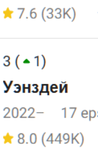 >>3426669 рейтинги серий. последняя всем прям вкатила. в среднем снижаются, но все еще высокие. обсуждение я хз как оценить. на имдб вот сейчас что в топе. даже имдб считает что чужой как земля популярнее уэнздей помойки. посмотрим что к финалу будет.