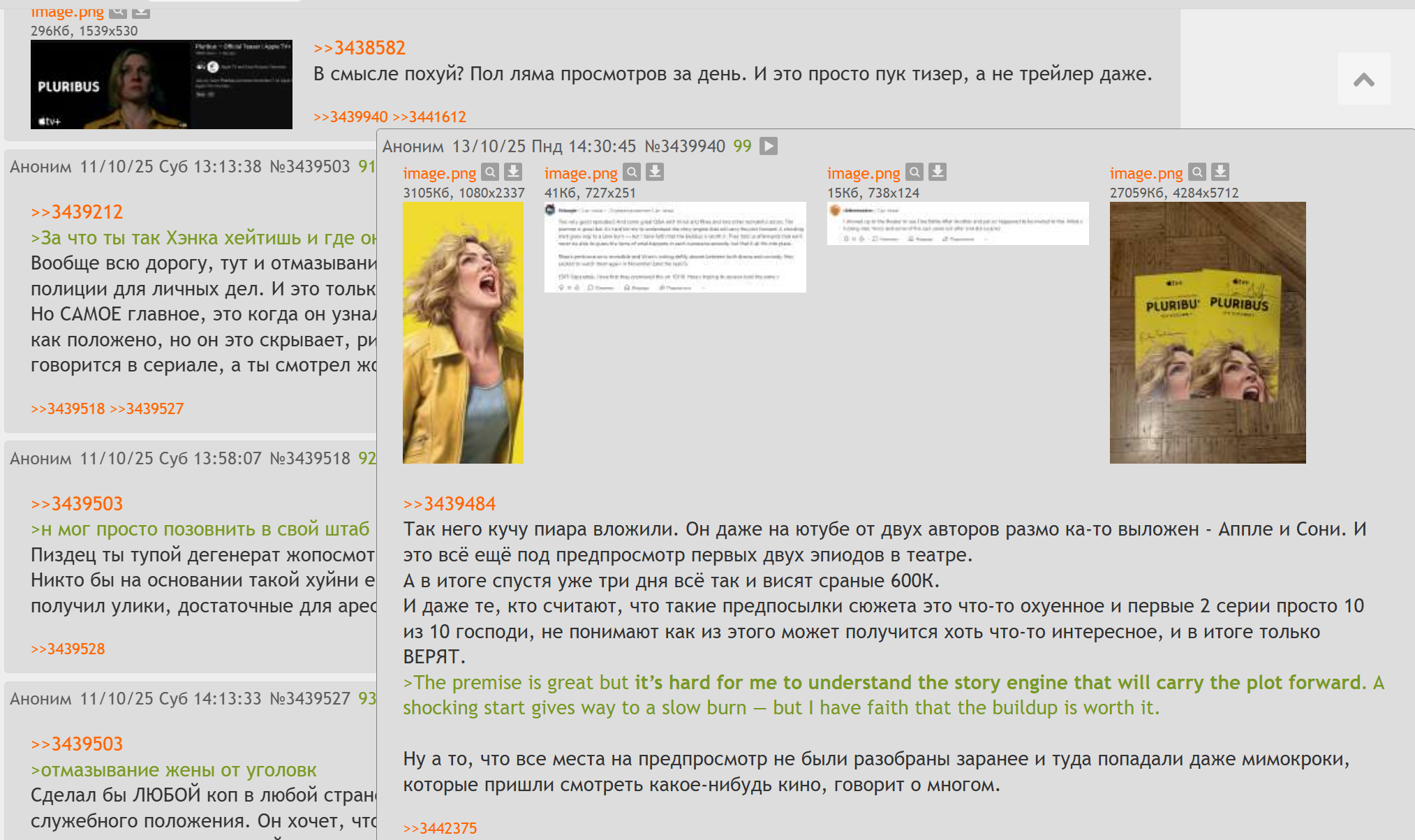 Тут и 5% годноты нет, что выходило за последнее время. Плюрибус - единственный сериал из достойных, тред которого живой и здоровый. И только из форса. Если бы не Эппл и не Гиллиган никто бы даже и тред не создал.