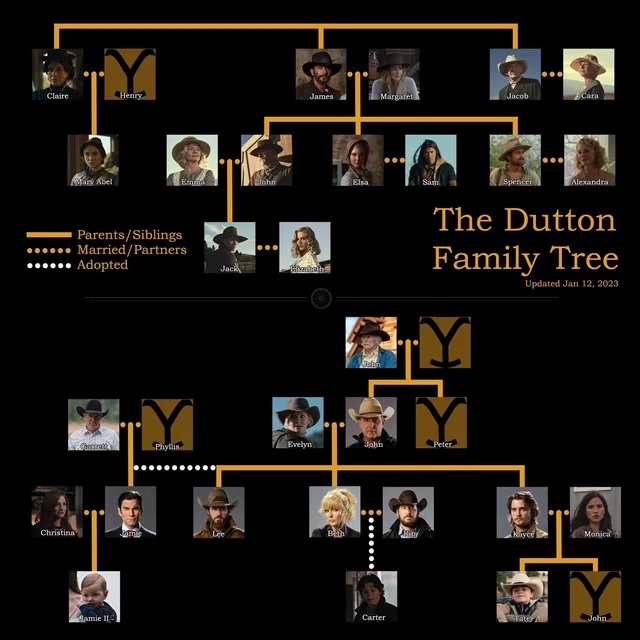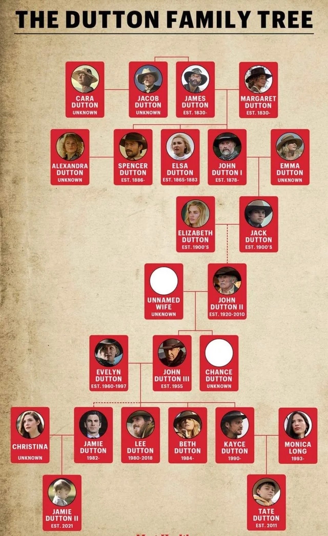 В общем, Джон Даттон 2 — потомок Спенсера, а не Джека Даттона. На схемах ошибка (ну или предположение, оказавшееся неверным). Тем не менее, в конце сериала как-то вскользь сказали про второго потомка Спенсера, который зачали от какой-то ноунеймовой вдовы. Это во-первых. А во-вторых совершенно неясно, что с потомком собственно Джека Даттона и Элизабет Даттон, которая уехала сразу после гибели Джека.