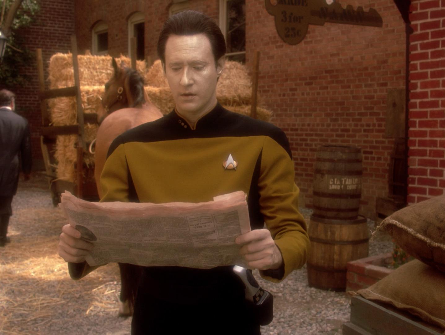 Тут прямо максимальный обсёр Дейты. Всю серию ходил рядом с мамашкой, утешал её, проигрывал записи сына, и в конце когда она за сына отомстила, он ее втоптал в говно, ты мол хуйню натворила, сыну теперь грустно и он разочарован тобой. Аж терминатором повеяло от такой эмпатии Дейты, мамашка небось повесилась после его слов.
