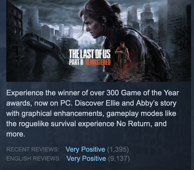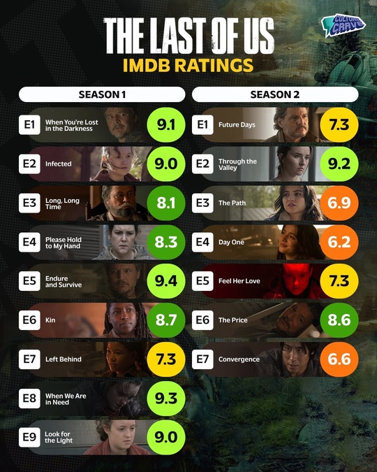 Из интересного, самые высокие оценки (выше 9 баллов) у эпизодов, которые либо расширяют недоработанные части игры (1 и 5 эпизоды для пролога и Питсбурга соответственно), либо напрямую показывает ее лучшую часть, как эпизод с зимой и каннибалами. Геи и лесбиянки зашли зрителям меньше всего - 8.1 и 7.3 балла соответственно.