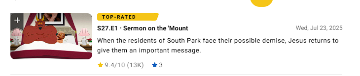 >S27.E1 ∙ Sermon on the 'Mount ⭐9.5/10 (11K) Бля. И это при том, что почти такие же оценки имеет легендарнейший вин про Скотта Тенормана, эпизод про Варкрафт. Сюр какой-то.